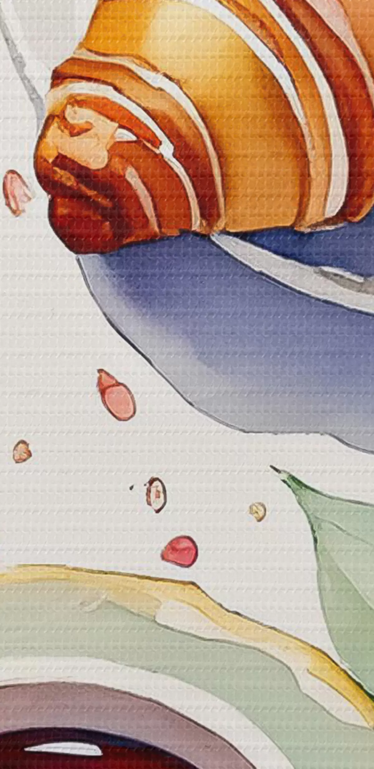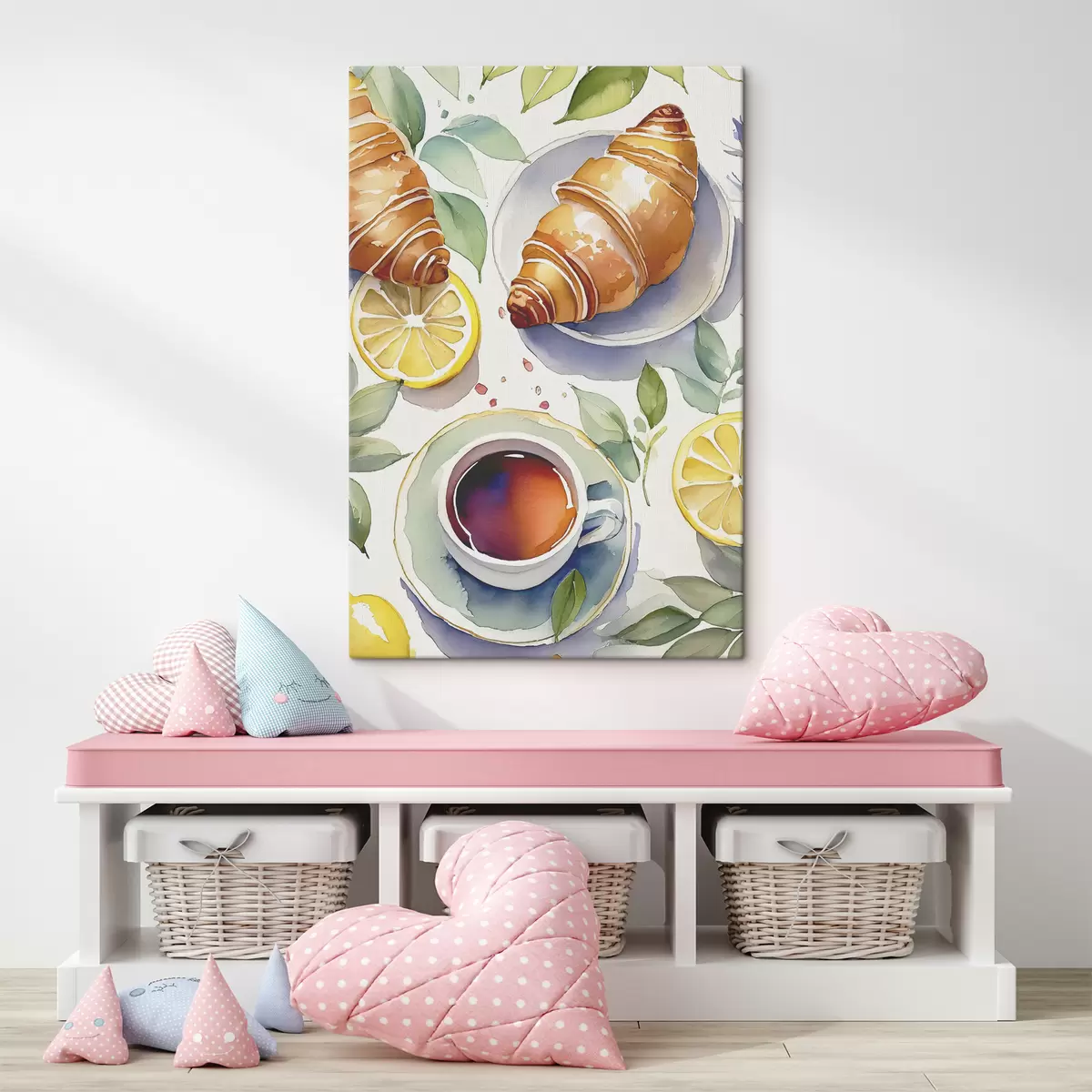 Paveikslas Kruasano akvarelė, arbatos puodelis, pusryčiai, citrinos, kaimiškas stilius Nr s38389