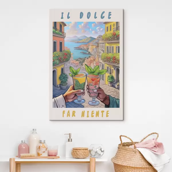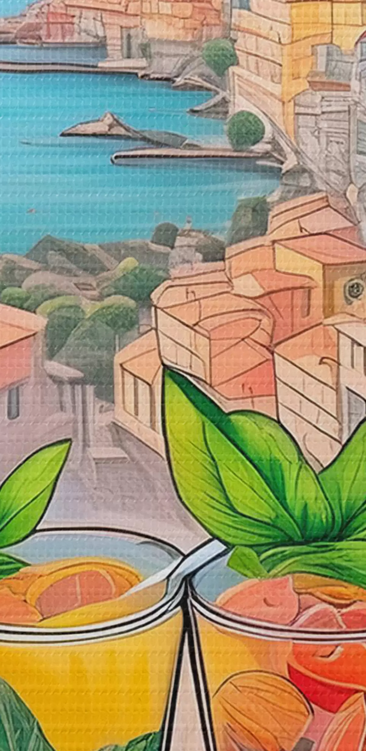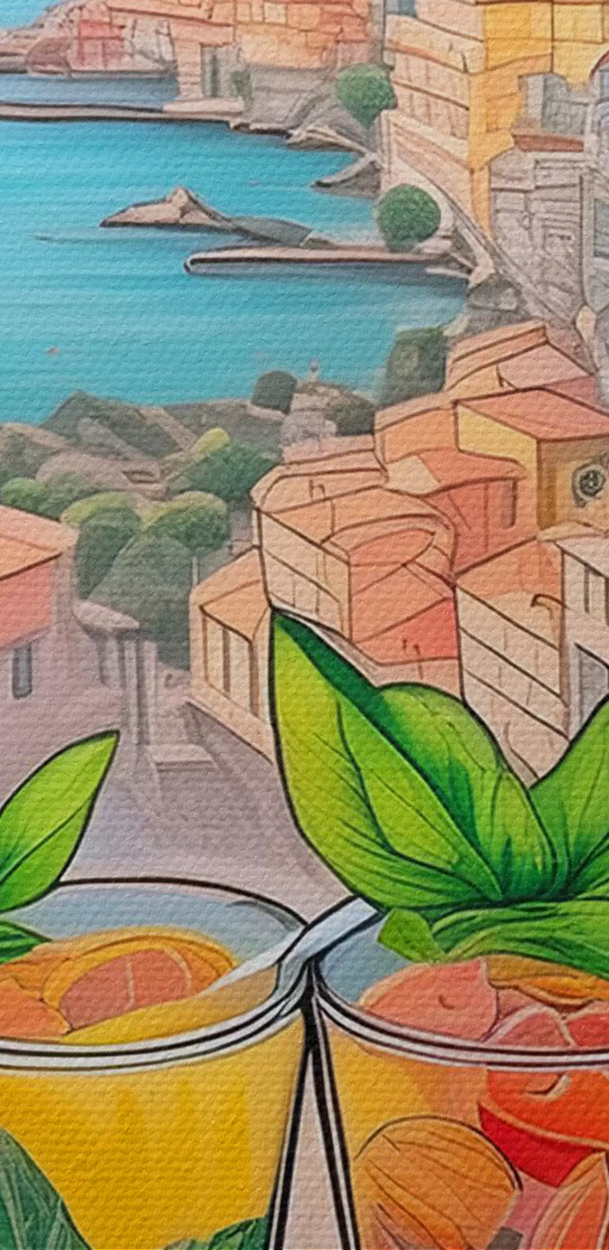 Paveikslas Italijos miestas, jūros pakrantė, kokteiliai, pašaukimas, architektūra, vasara, akvarelė Nr s38392