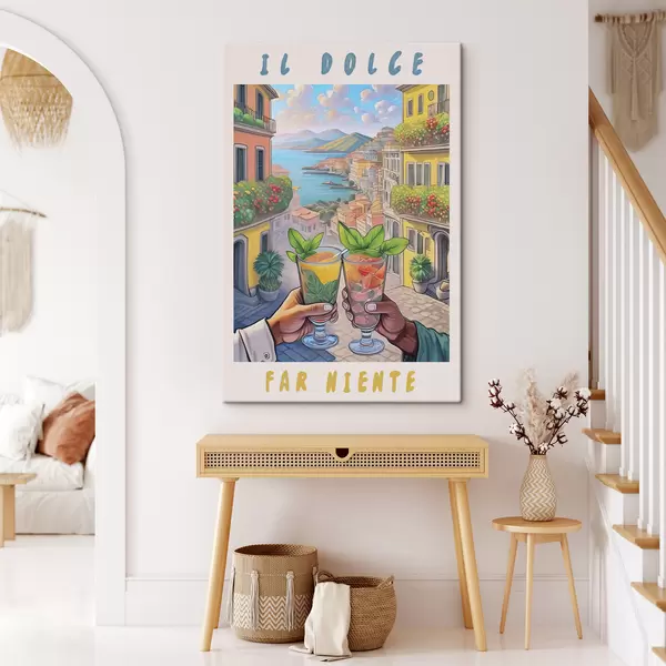 Paveikslas Italijos miestas, jūros pakrantė, kokteiliai, pašaukimas, architektūra, vasara, akvarelė Nr s38392