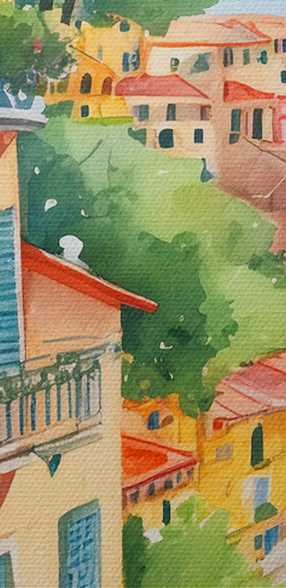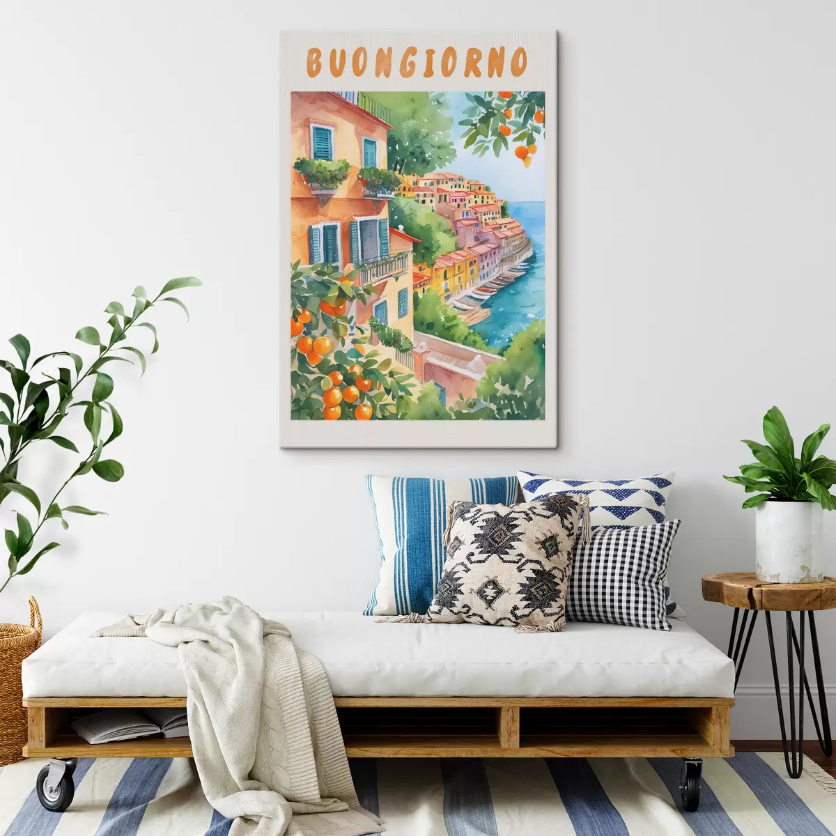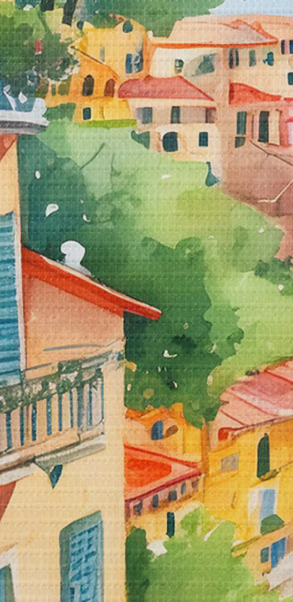Paveikslas Italijos miesto architektūra, Amalfio jūros pakrantė, vasara, akvarelė, citrinmedis Nr s38393