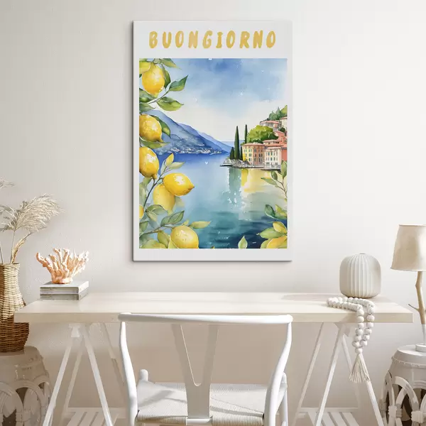 Paveikslas Italijos ežeras, vasara, akvarelė, gamtos peizažas, citrinos, miesto architektūra Nr s38394