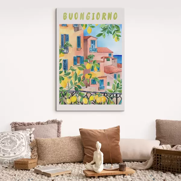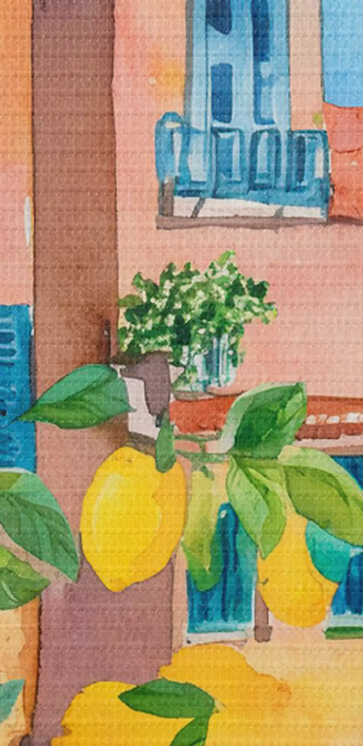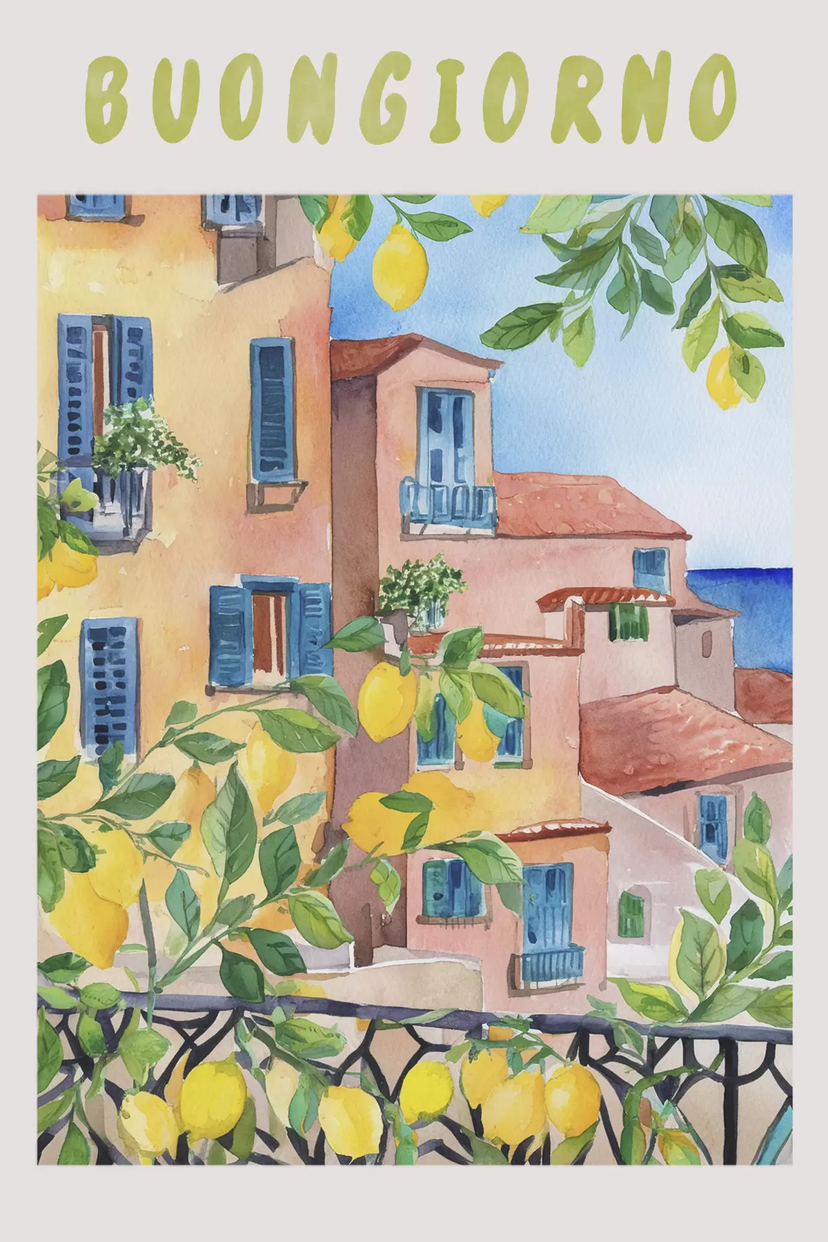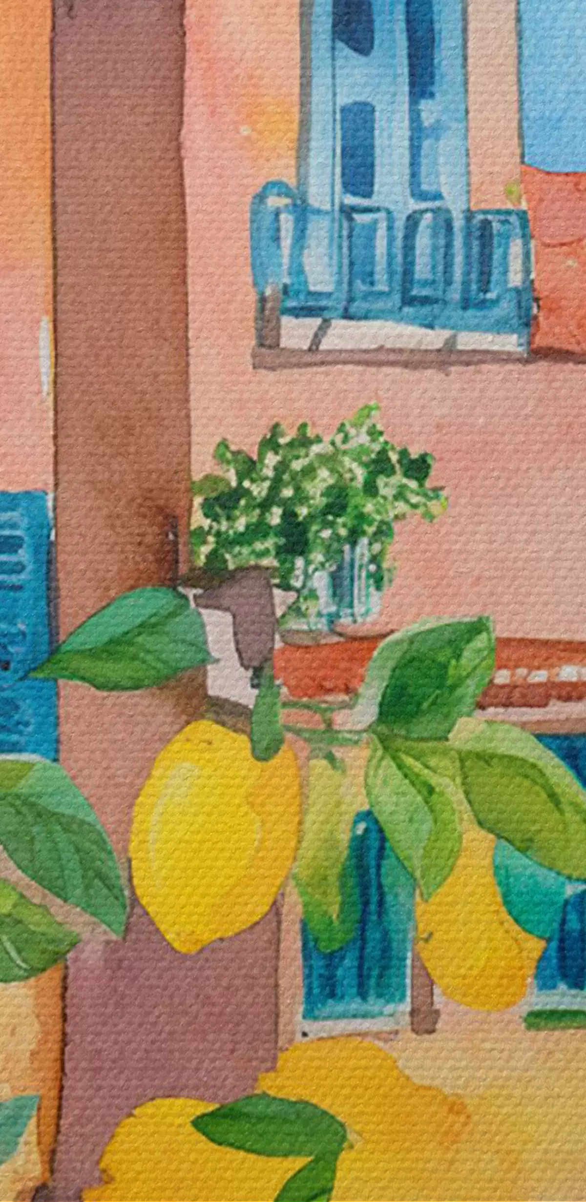 Paveikslas Italijos miesto architektūra, jūros pakrantė, vasara, akvarelė, citrinmedis Nr s38395