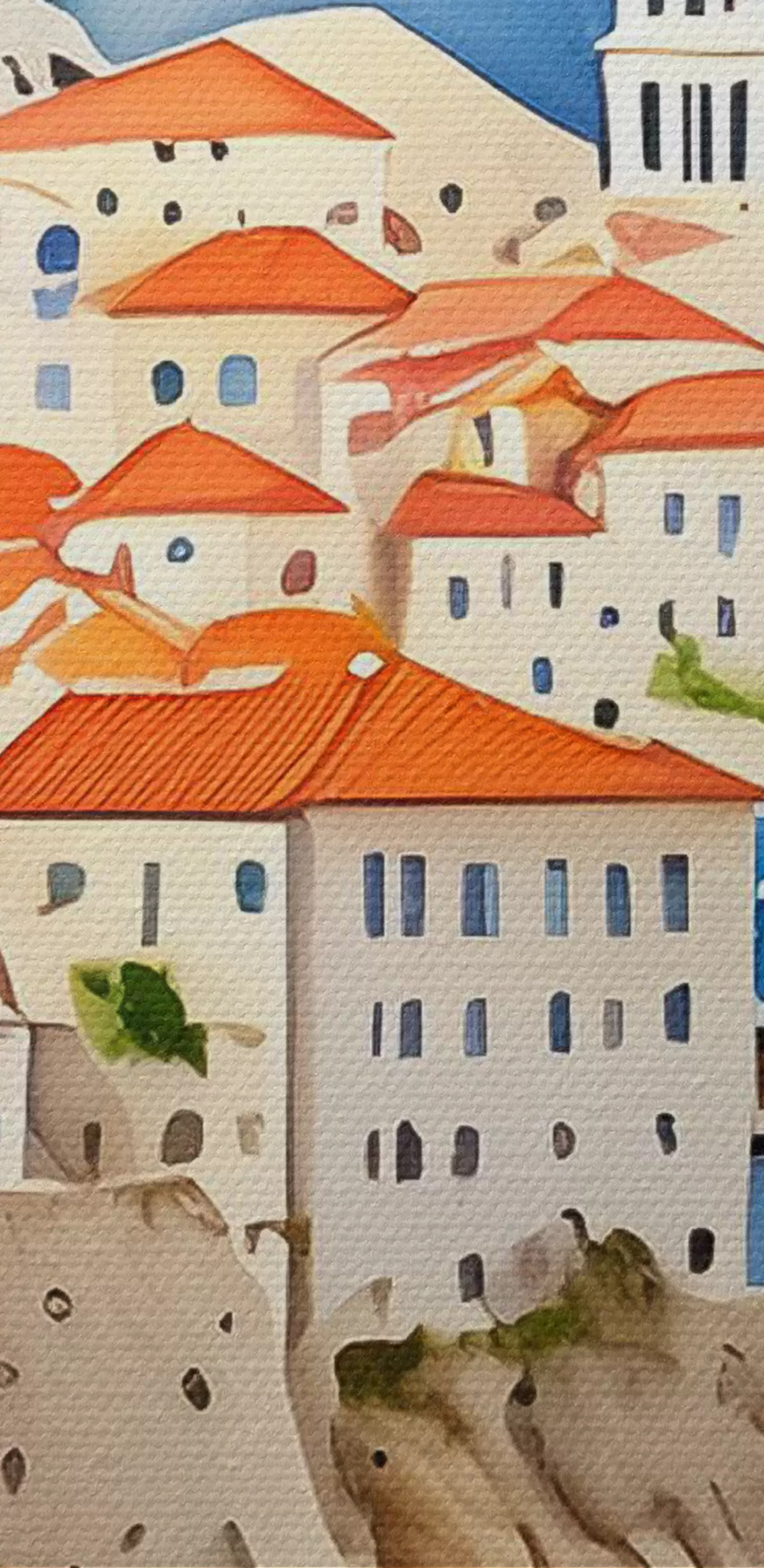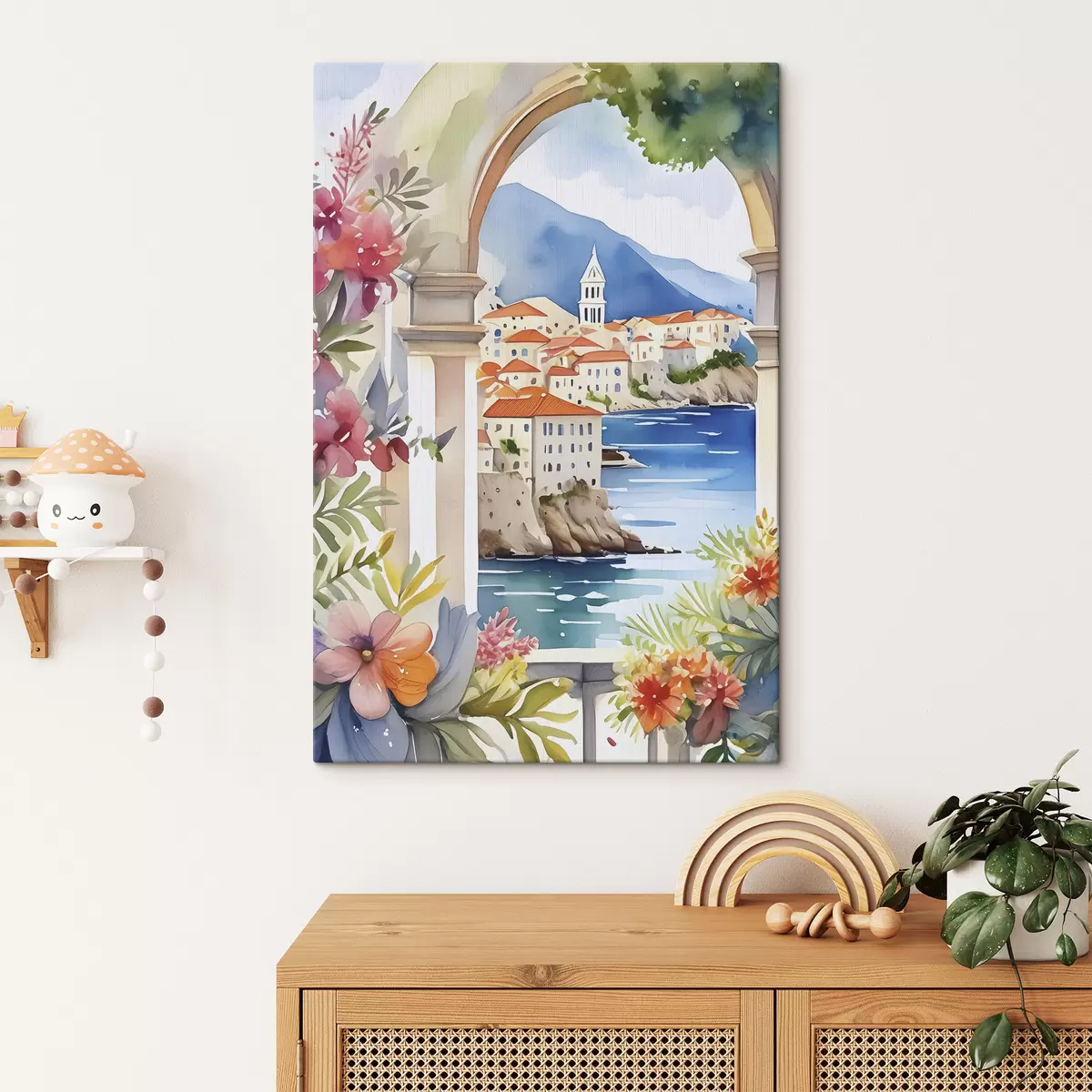 Paveikslas Viduržemio jūros architektūra, akvarelė, vasaros gėlės, mėlyna jūra, kalnai Nr s38408
