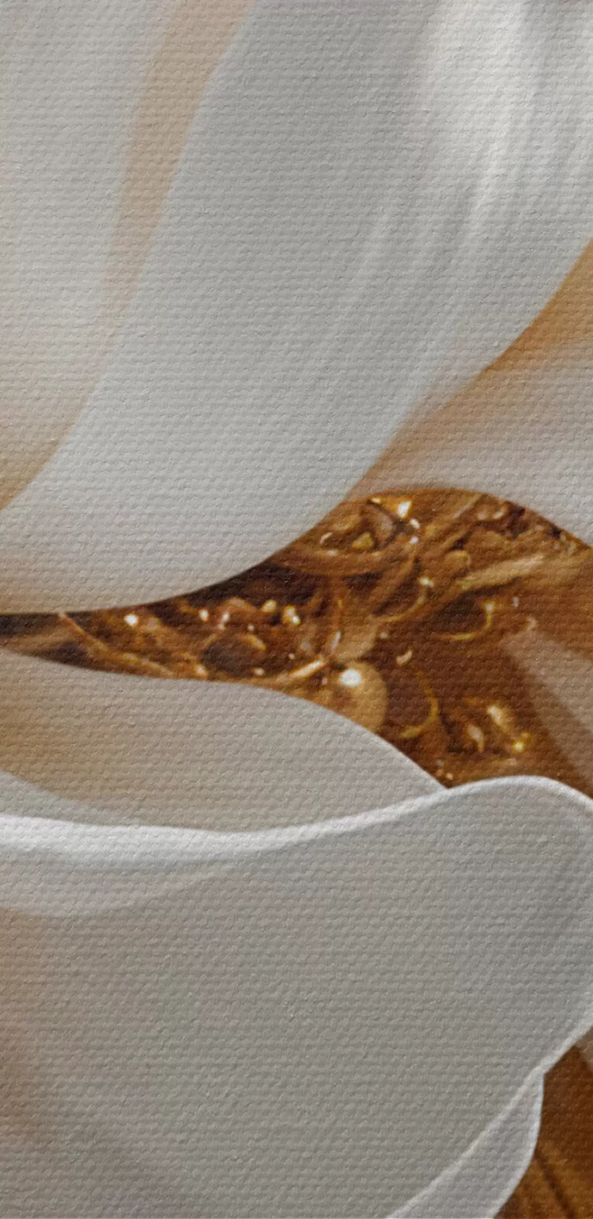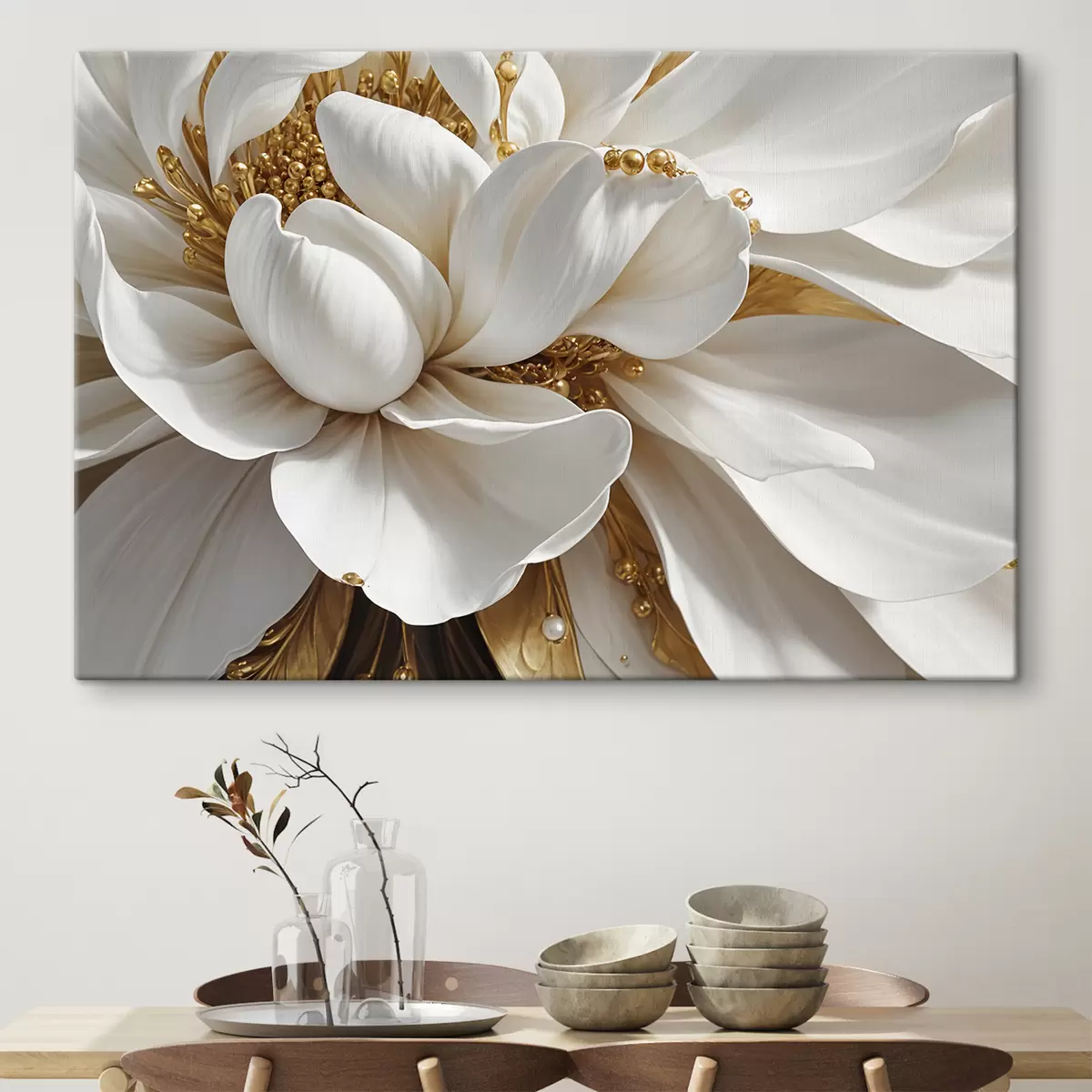 Paveikslas Didelė balta gėlė su švelniais žiedlapiais ir auksiniais kuokeliais minimalizmo centre Nr s38762
