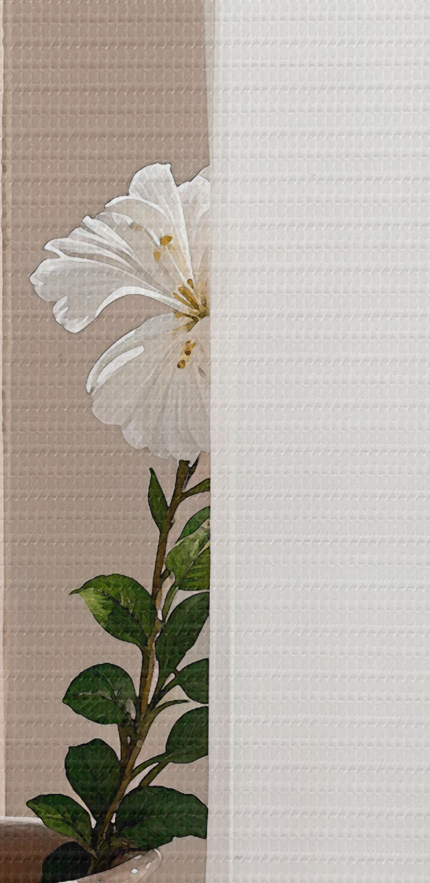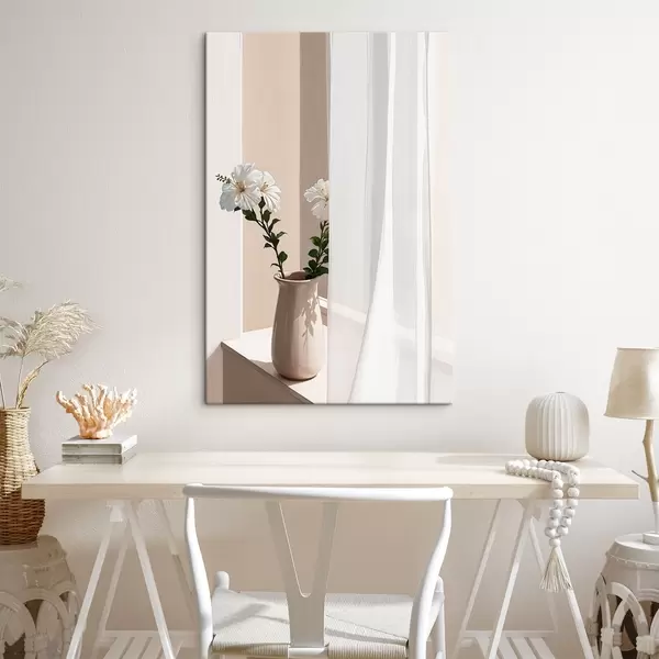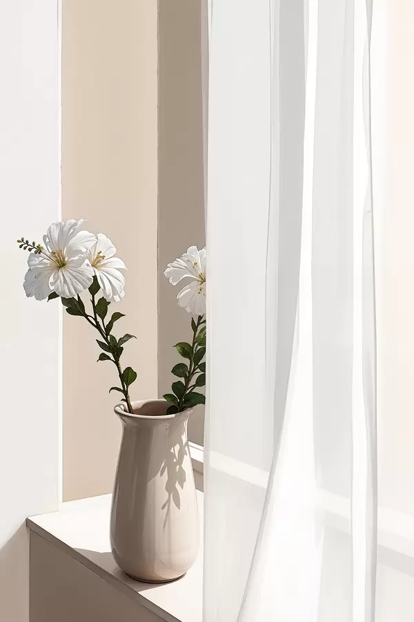 Paveikslas Baltų gėlių vaza ant palangės su užuolaida minimalizmo fone Nr s38772