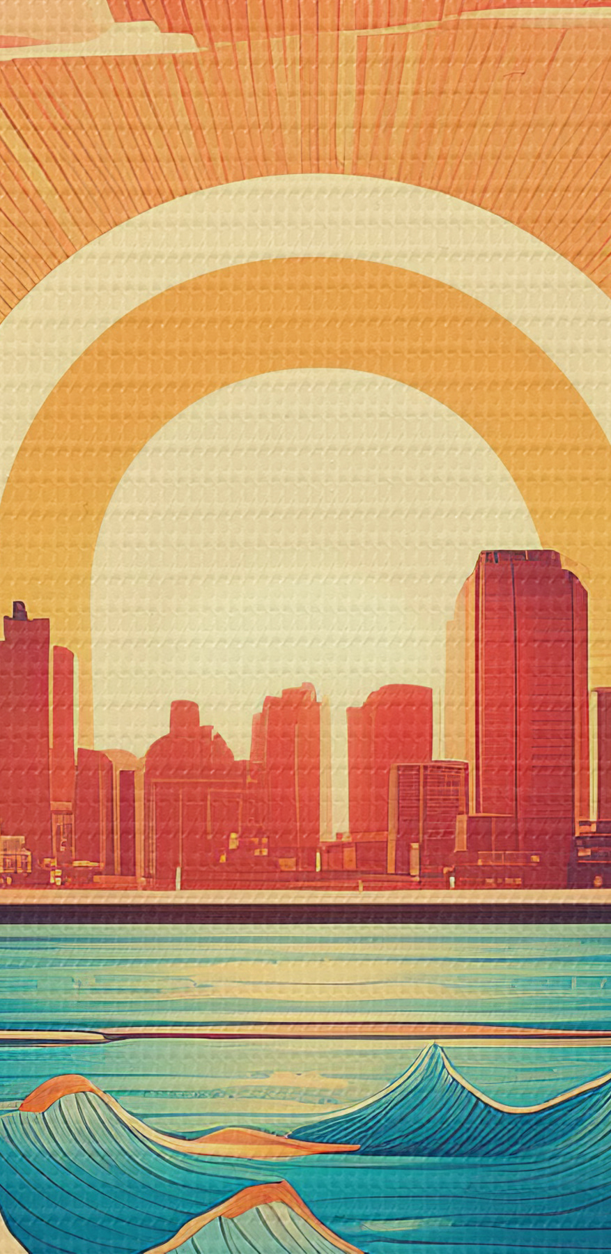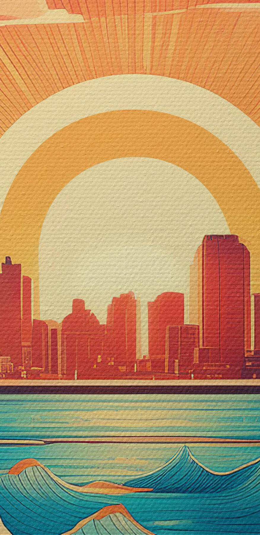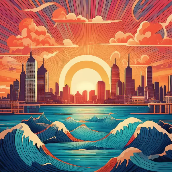 Paveikslas Saulėtekis virš miesto prie jūros, piešiantis retro stiliumi Nr s38810