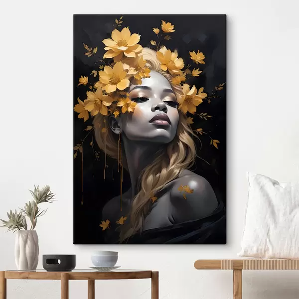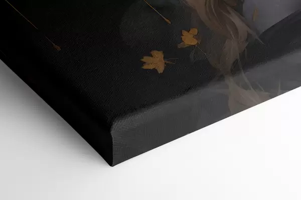 Paveikslas Jaunos moters portretas, apsuptas geltono rudens lapų tamsiame fone Nr s38834