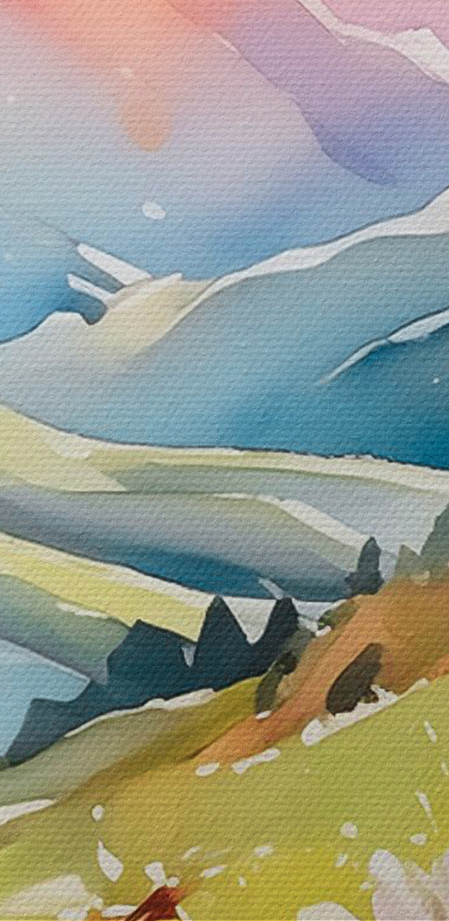 Paveikslas Vasaros kalnai, spalvingas saulėlydis, gėlės, akvarelė, gamtos peizažai Nr s38840