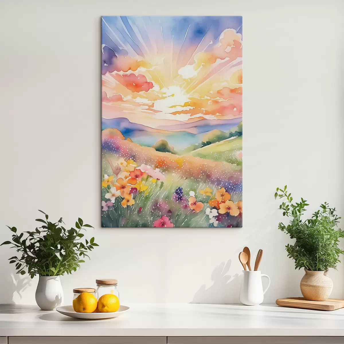 Paveikslas Saulėlydis vasaros lauke, gėlės, saulė, spalvingas dangus, debesys, gamta Nr s38842