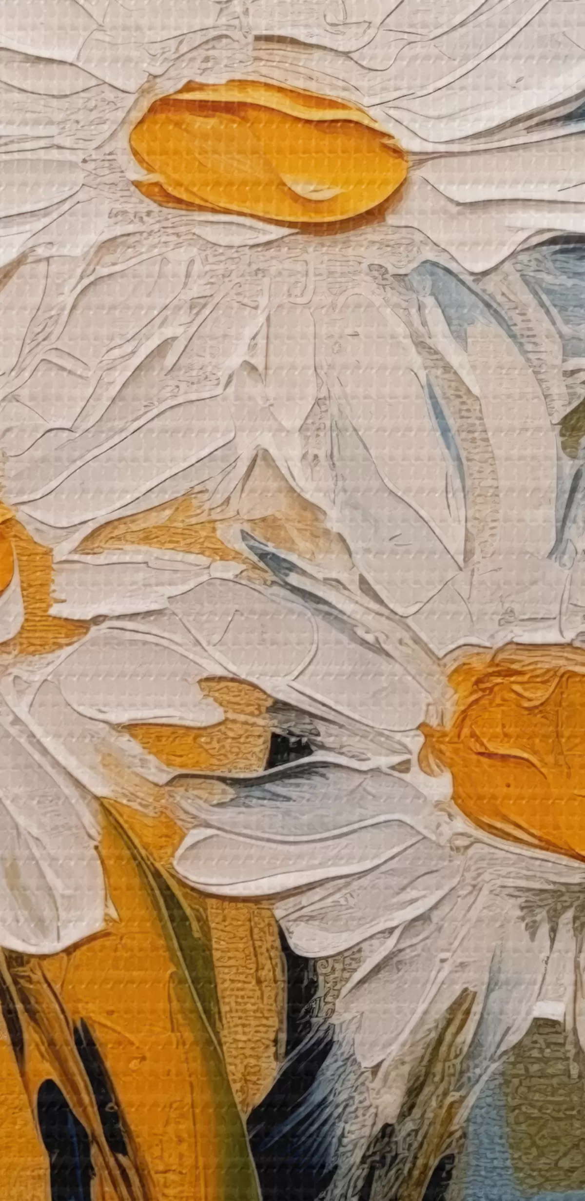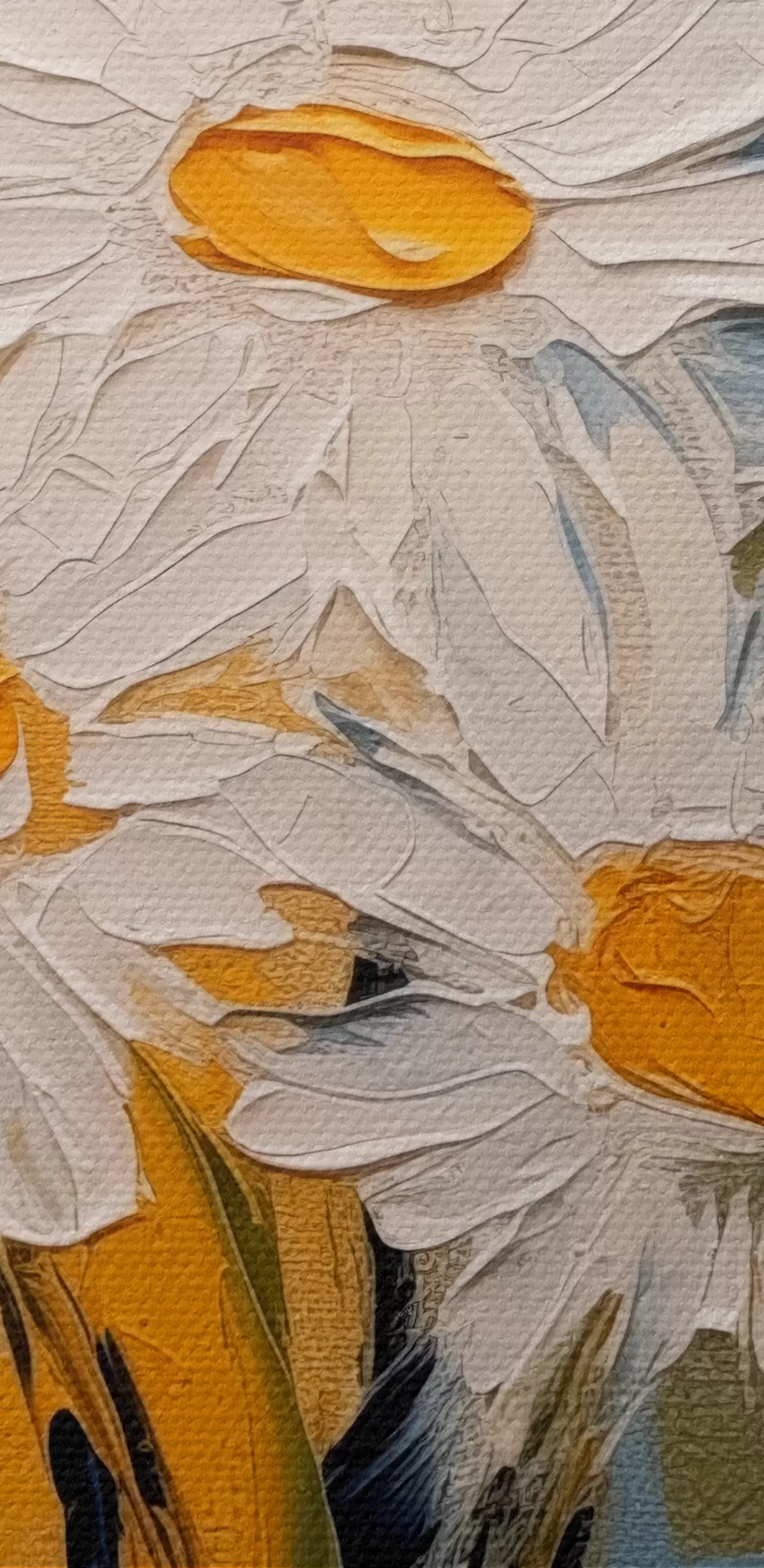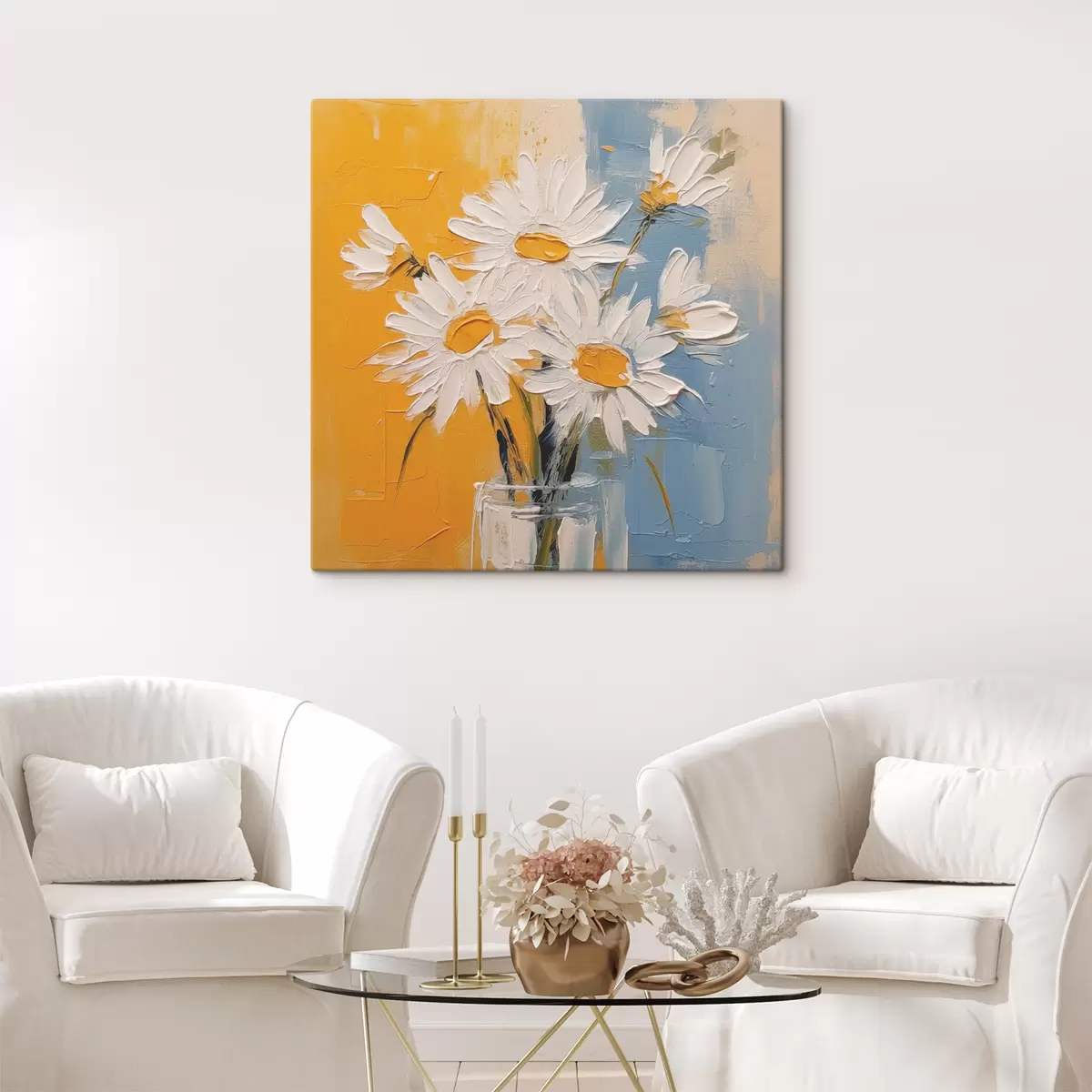 Paveikslas Baltos ramunėlės stiklinėje vazoje mėlyname ir geltoname fone, aliejinės tapybos imitacija, dideli potėpiai Nr s38907