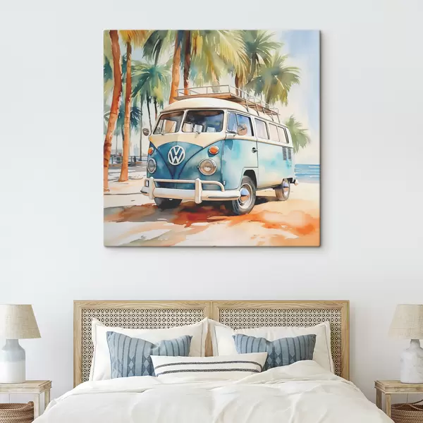 Paveikslas Kelioninis automobilis stovi paplūdimyje palmių akvarelės fone Nr s38911