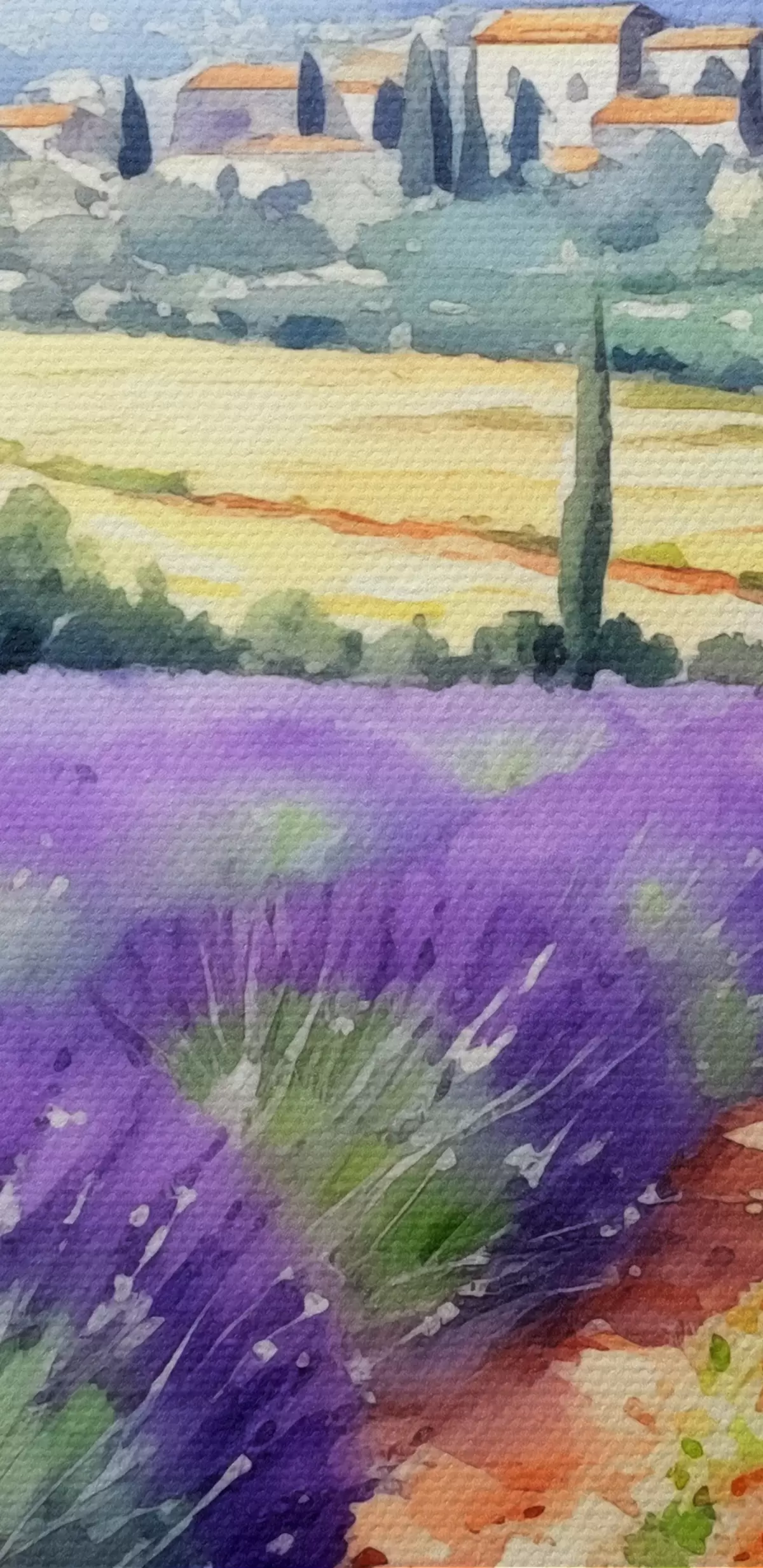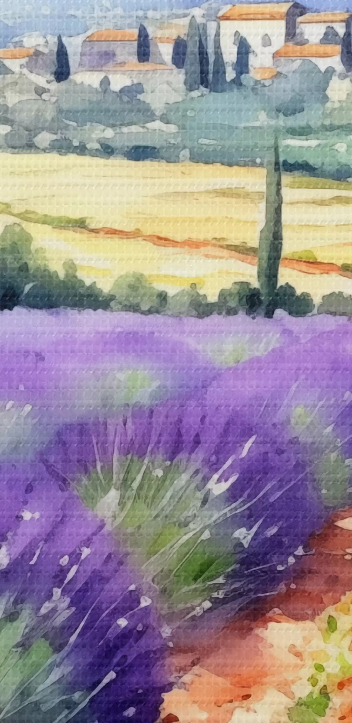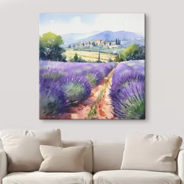 Paveikslas Akvarelės levandų laukas kalnų ir kaimo fone Nr s38913