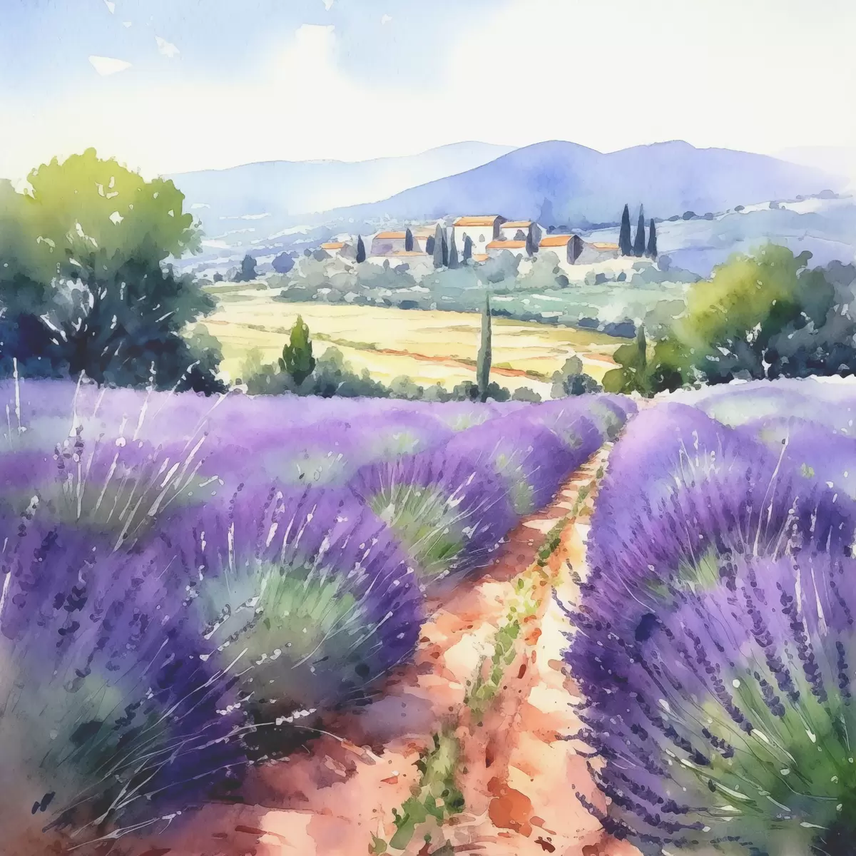Paveikslas Akvarelės levandų laukas kalnų ir kaimo fone Nr s38913