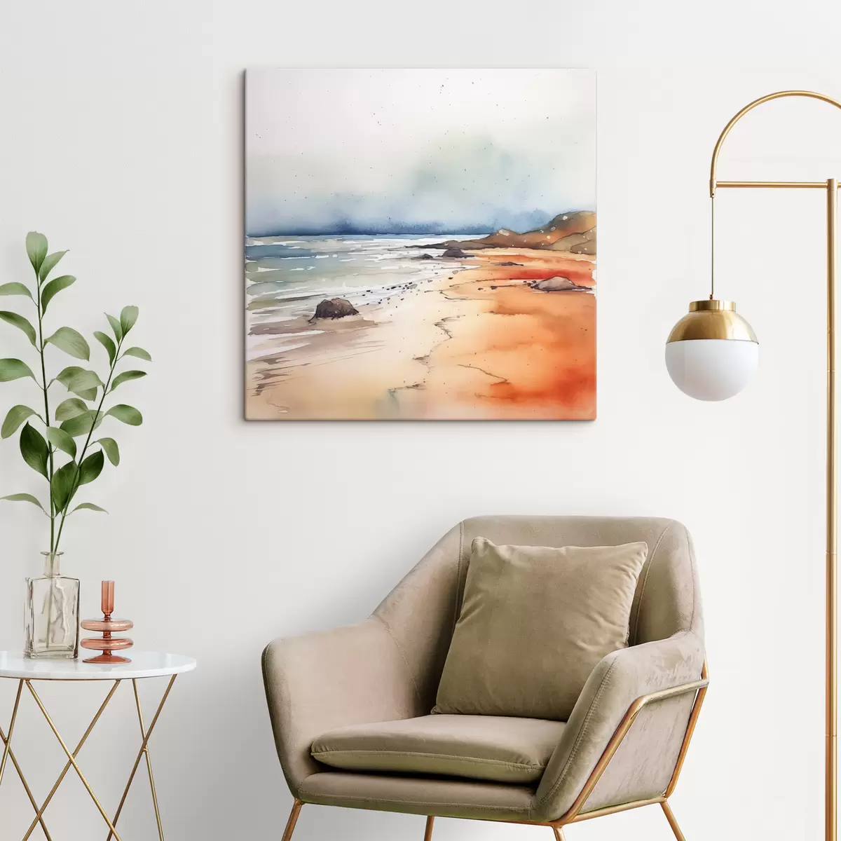 Paveikslas Jūra ir paplūdimys, lietus, akvarelė, purslai, peizažas, peizažas, mėlyna, oranžinė spalva Nr s38936
