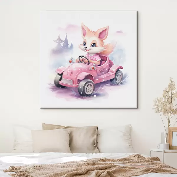 Paveikslas Lapė važiuoja rožiniu automobiliu, vaikiška akvarelės iliustracija Nr s38943