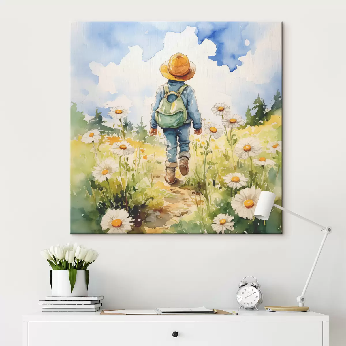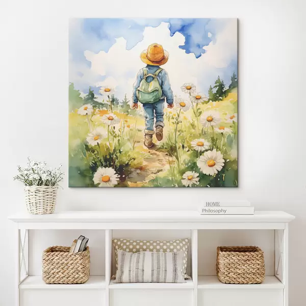 Paveikslas Vaikinas kaubojiška kepure su žalia kuprine už nugaros ir mėlynu kostiumu eina taku ramunėlių lauke, akvarelė Nr s38946