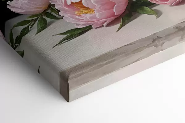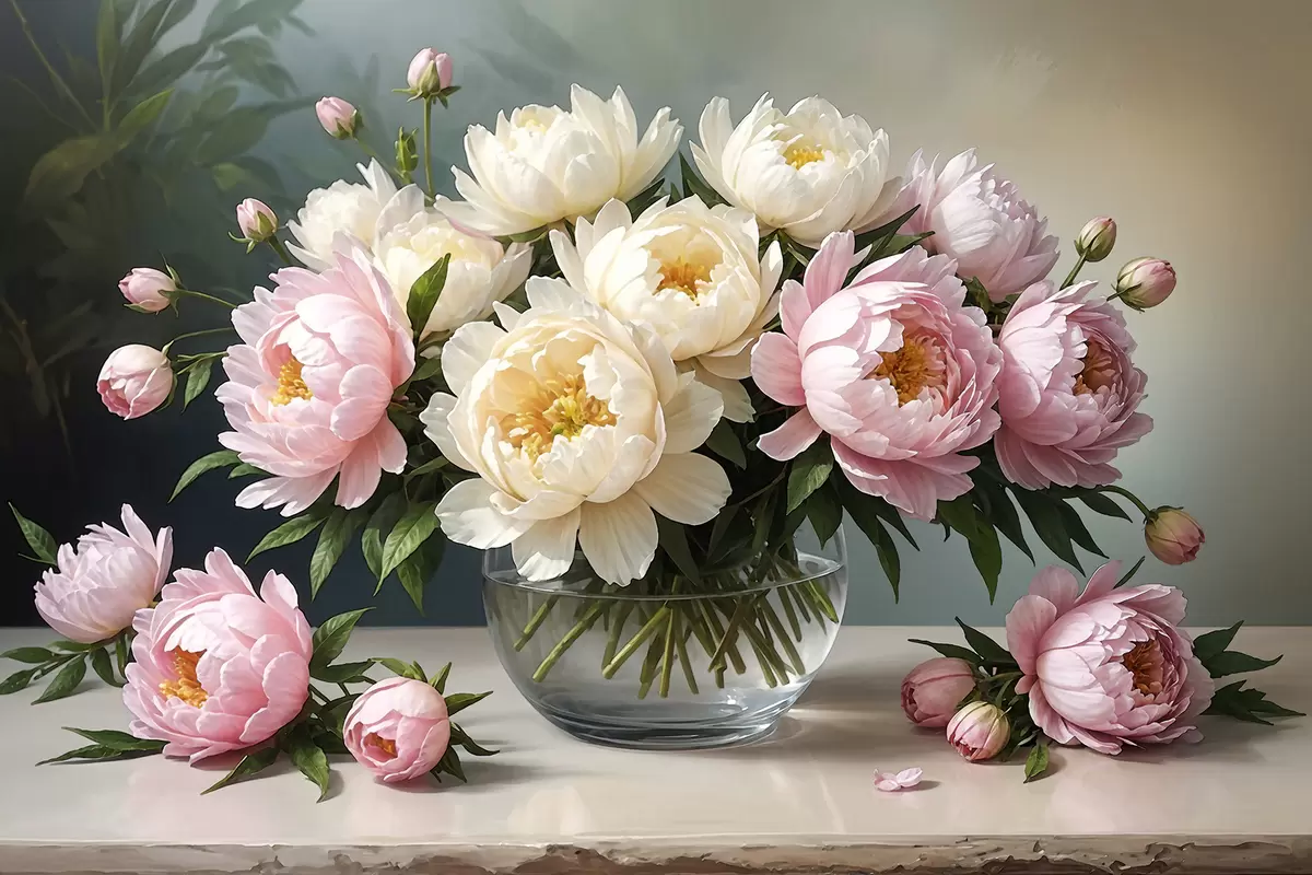 Paveikslas Gražių baltų ir rožinių bijūnų puokštės paveikslas stiklinėje vazoje ant medinio stalo Nr s38967