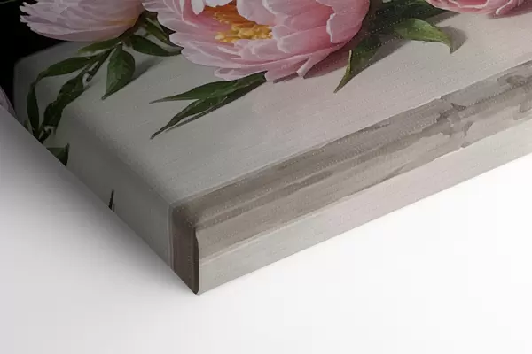 Paveikslas Gražių baltų ir rožinių bijūnų puokštės paveikslas stiklinėje vazoje ant medinio stalo Nr s38967