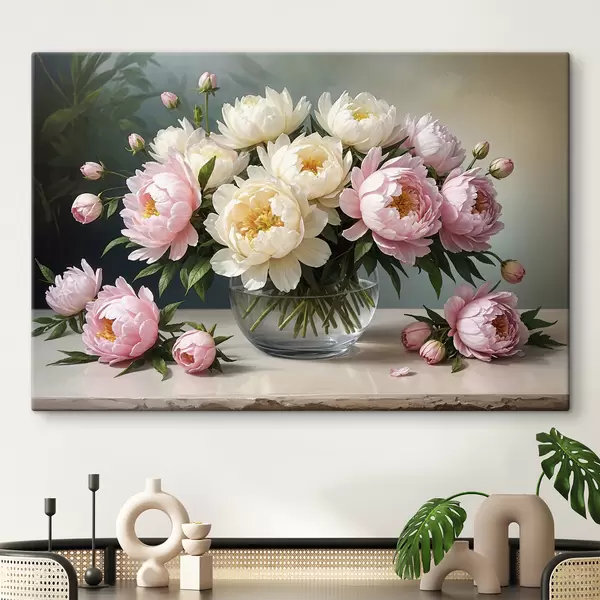 Paveikslas Gražių baltų ir rožinių bijūnų puokštės paveikslas stiklinėje vazoje ant medinio stalo Nr s38967