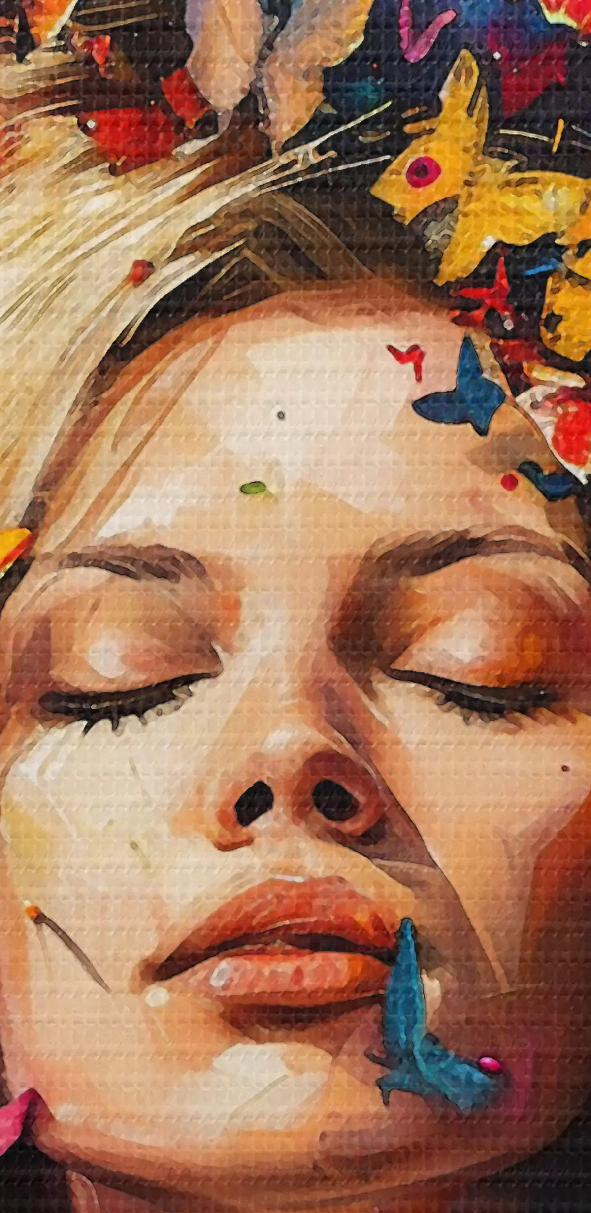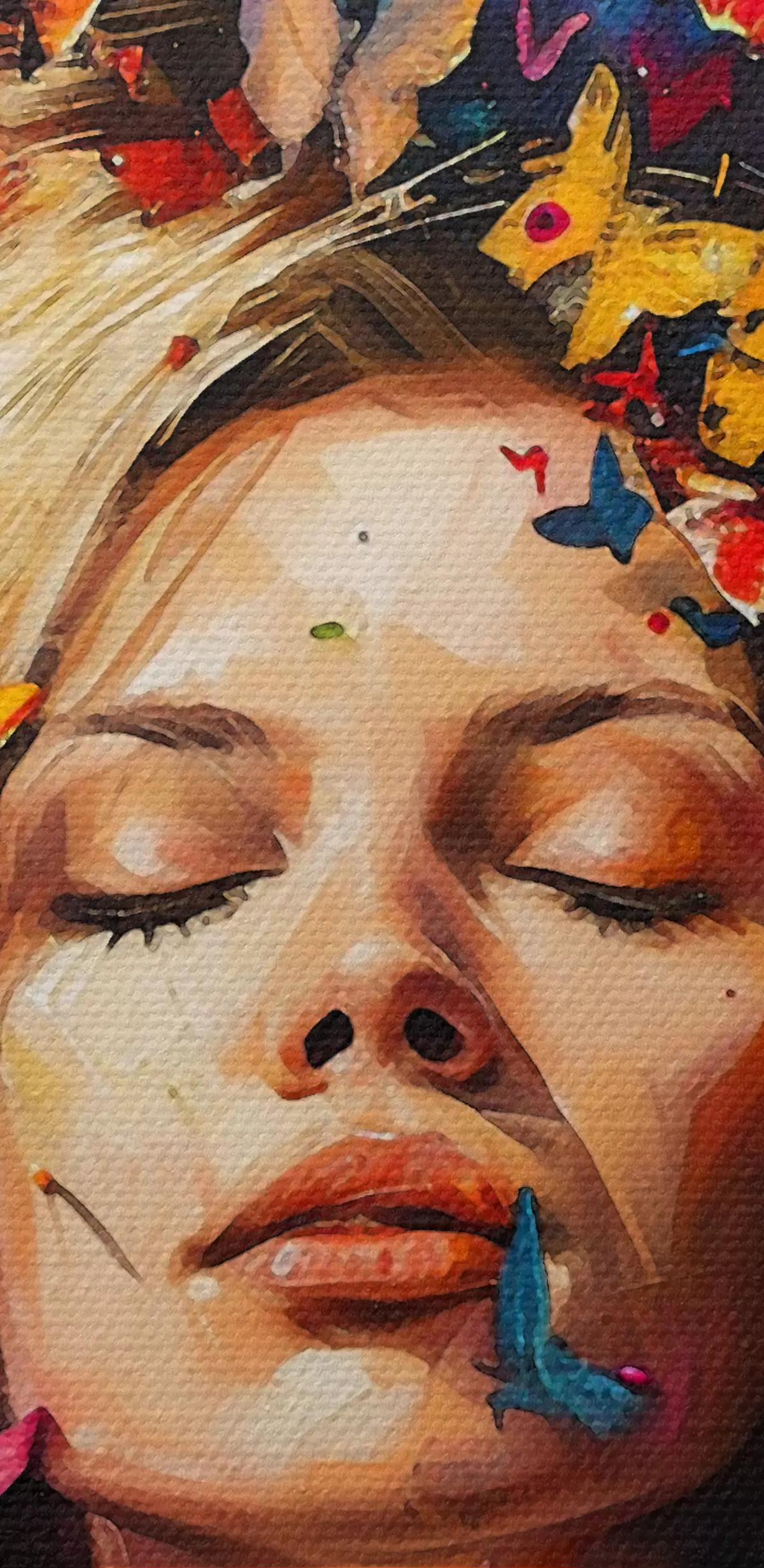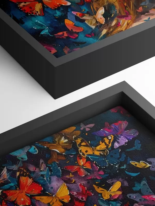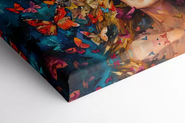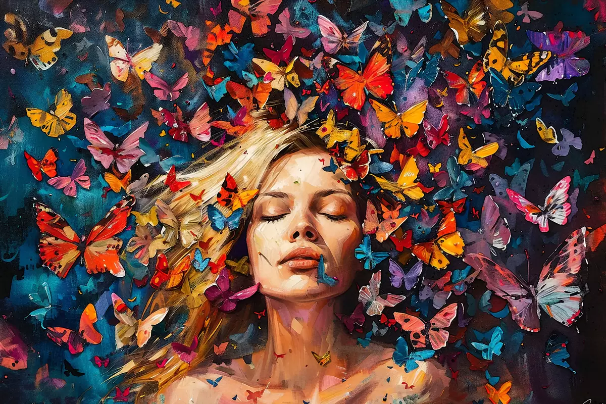 Paveikslas Aliejinis paveikslas, kuriame vaizduojama jauna moteris tamsiame fone apsupta spiečiaus spalvingų drugelių Nr s38972