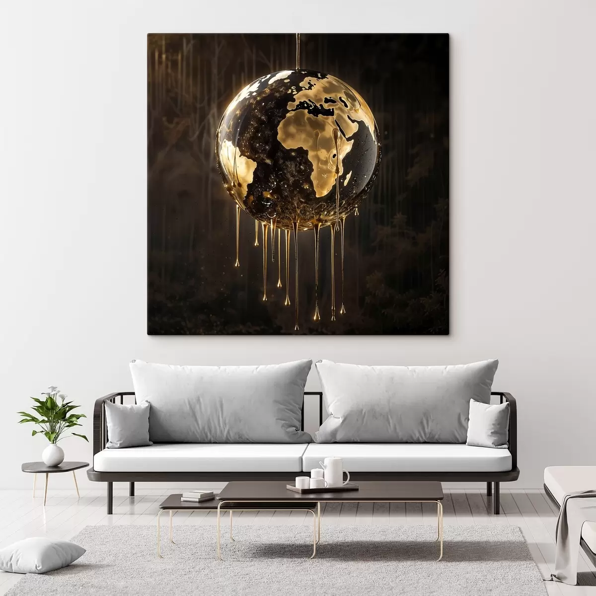 Paveikslas Švytintis gaublys, vaizduojantis Žemę tamsiame fone, apsuptą lašančio skysčio Nr s38983