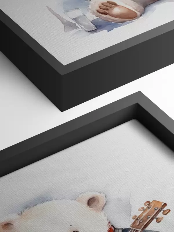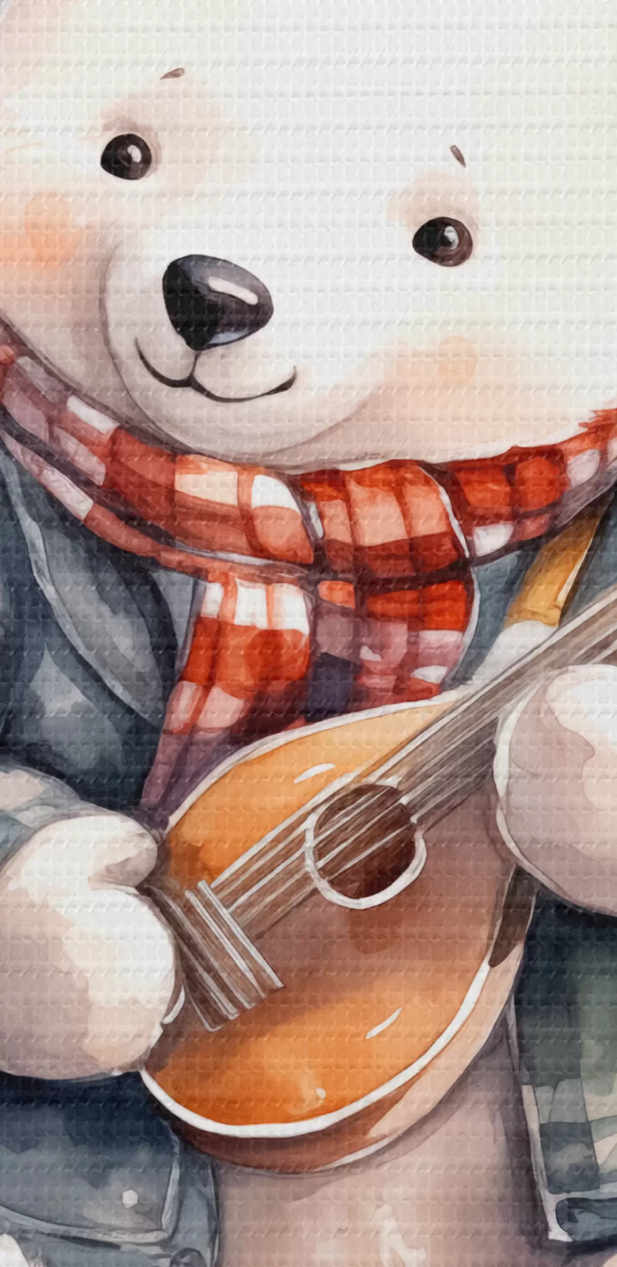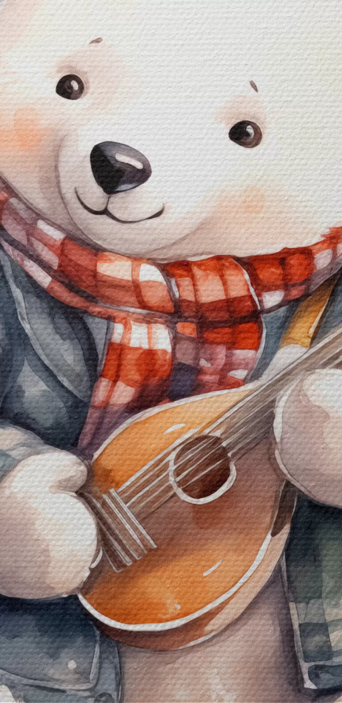 Paveikslas Baltasis lokys muzikantas mėlynu languotu kostiumu ir raudona skarele groja gitara vaikiška akvarelės iliustracija Nr s39120