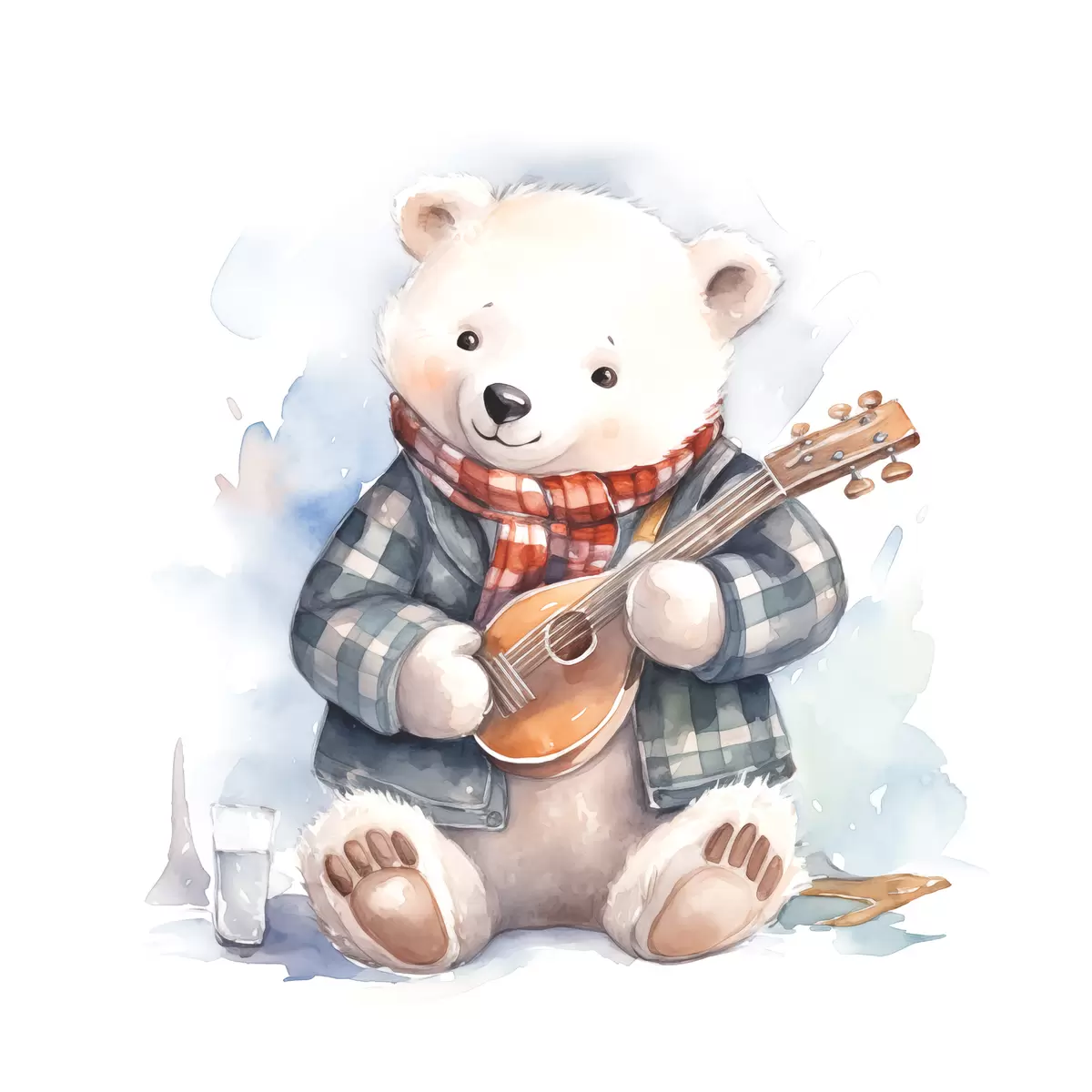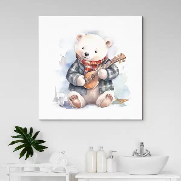 Paveikslas Baltasis lokys muzikantas mėlynu languotu kostiumu ir raudona skarele groja gitara vaikiška akvarelės iliustracija Nr s39120