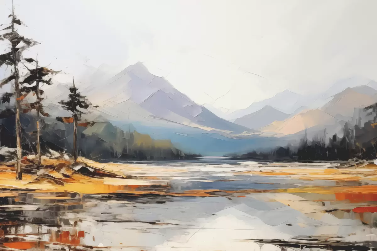 Paveikslas Kalnų grandinės slėnyje aliejinė tapyba, peizažas, gamta, mėlyna, balta geltona spalva Nr s39128
