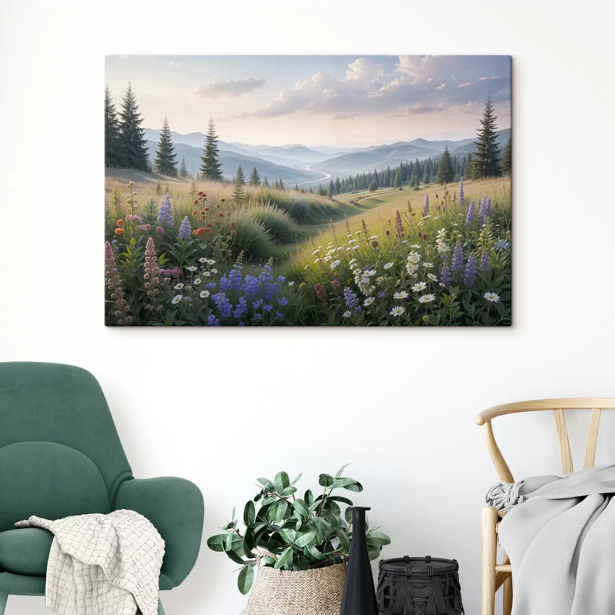 Paveikslas Kalnų peizažas su žolėta pieva pirmame plane, užpildyta spalvingomis lauko gėlėmis Nr s39382