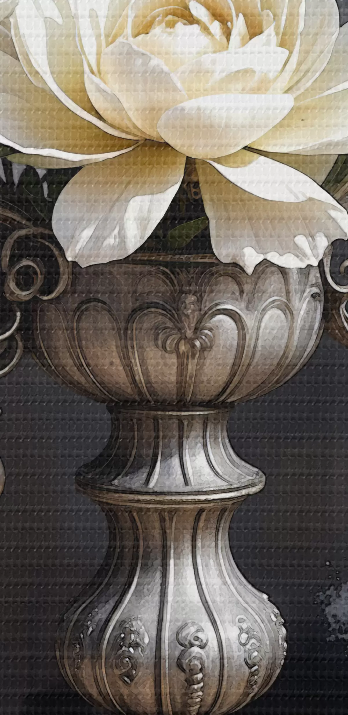 Paveikslas Didelių baltų jurginų gėlių puokštė puošnioje sidabrinėje vazoje, apsupta uždegtų žvakių ant medinio stalo Nr s39384