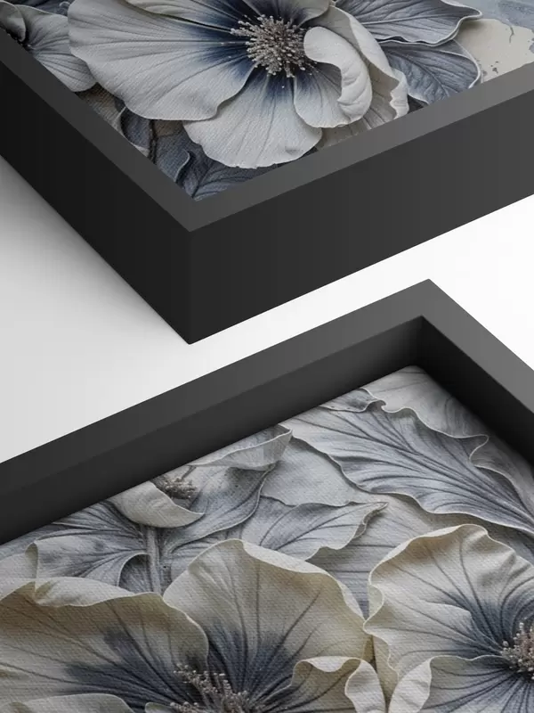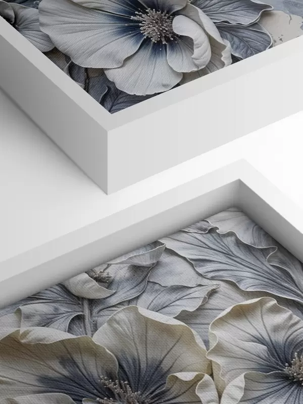 Paveikslas Didelis pilkos ir baltos spalvos aliejaus paveikslas su gėlėmis su įmantriomis detalėmis minkštame, neryškiame fone Nr s39385