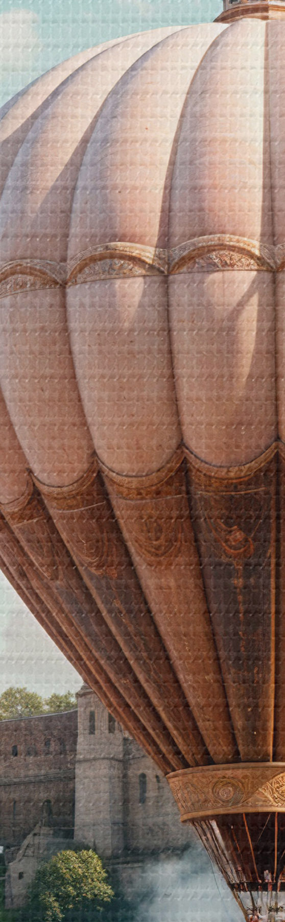 Paveikslas Fantazijos pilis apsupta rožinių oro balionų, plūduriuojančių debesuotame danguje virš vešlaus, žalio kraštovaizdžio Nr s39387