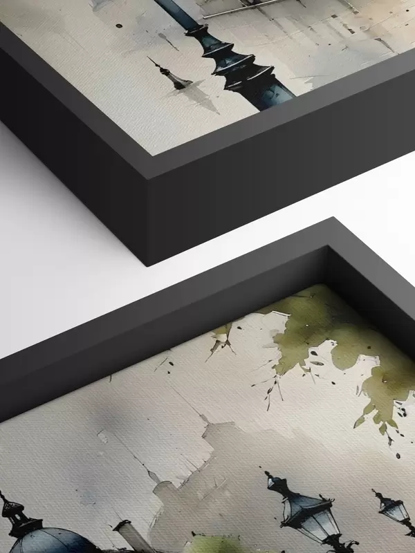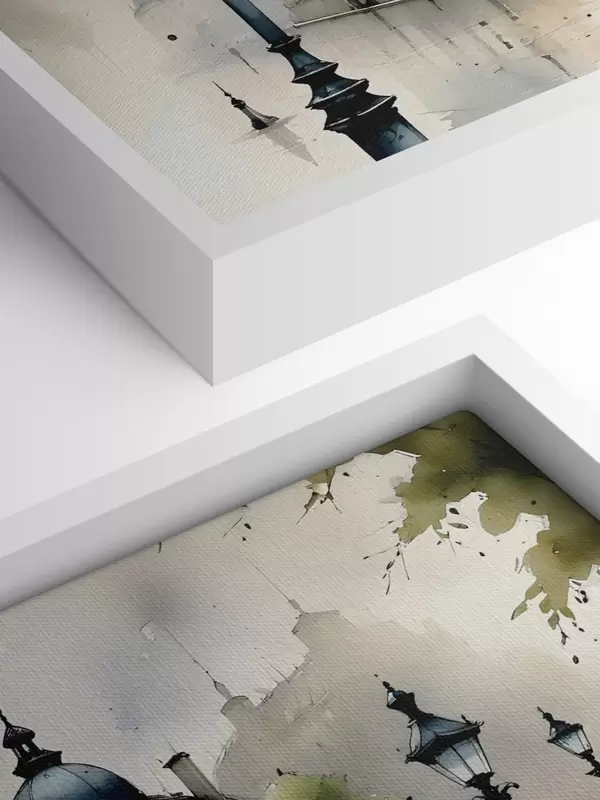 Paveikslas Didingas pastato akvarelės menas, apsuptas žibintų stulpų ir medžių, lietingą dieną Nr s39391