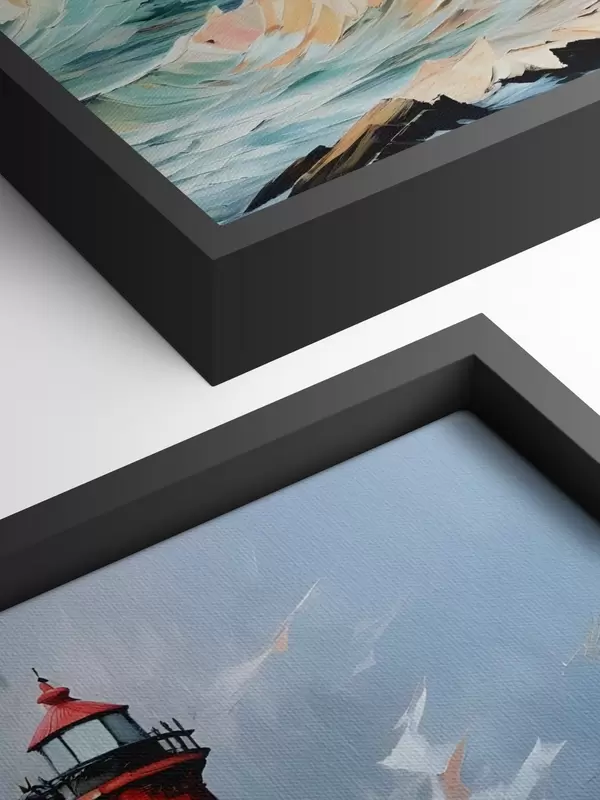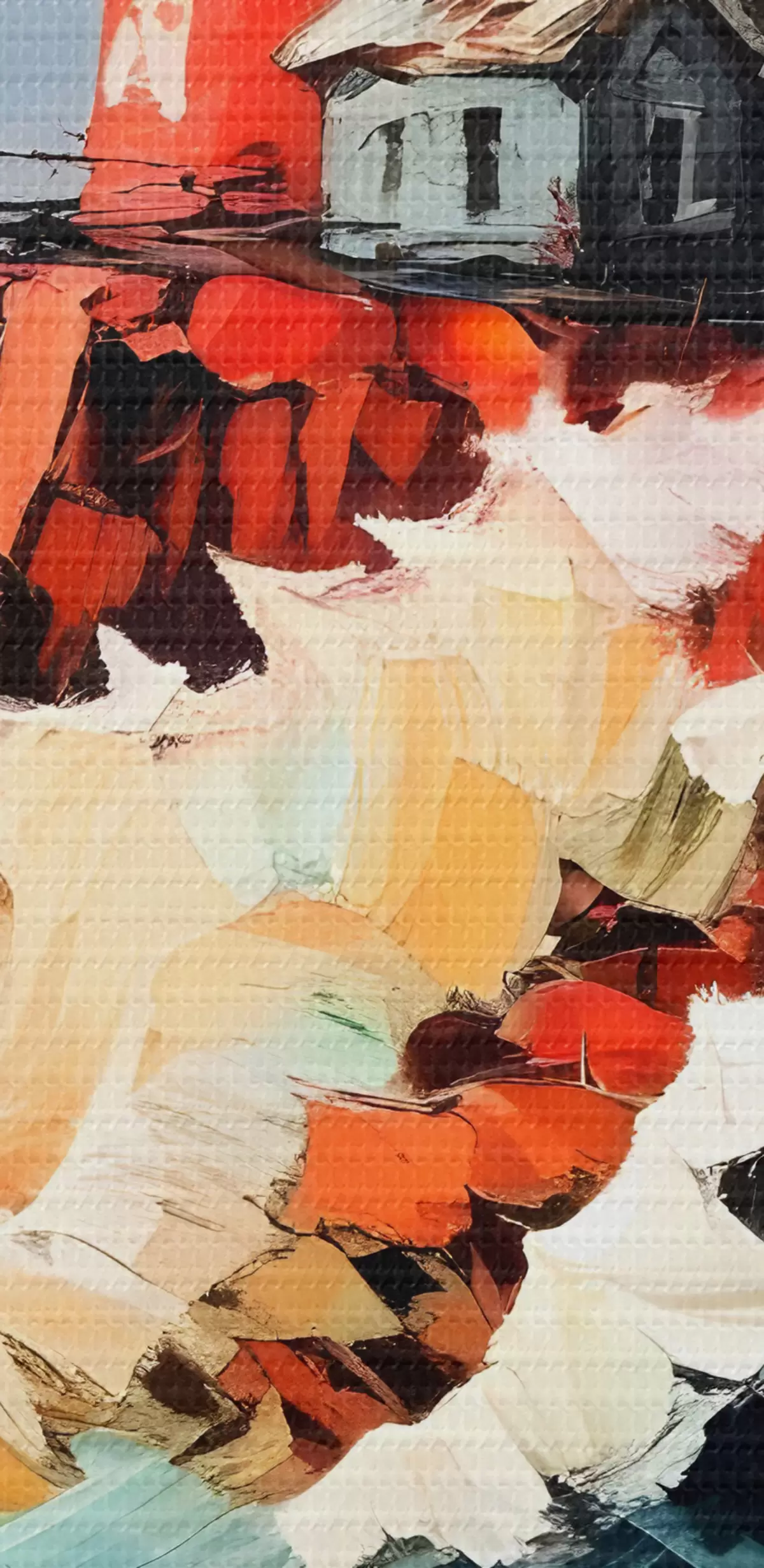 Paveikslas Paveikslas su raudonu švyturiu, stovinčiu aukštai ant uolėtos uolos, apsuptas daužančių bangų ir audringo dangaus Nr s39392