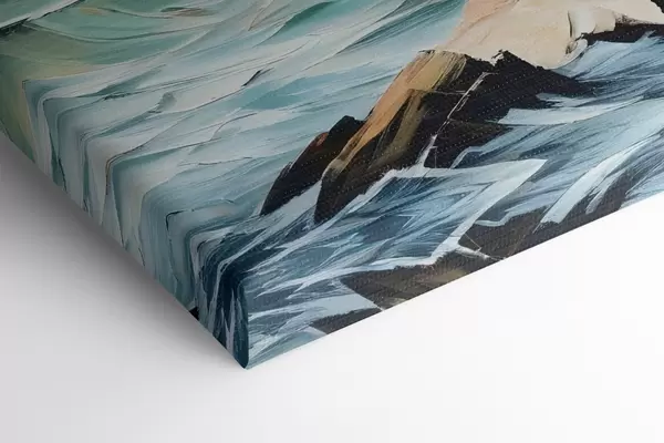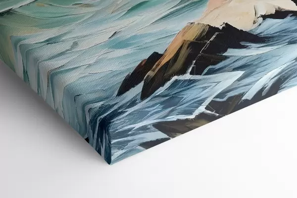 Paveikslas Paveikslas su raudonu švyturiu, stovinčiu aukštai ant uolėtos uolos, apsuptas daužančių bangų ir audringo dangaus Nr s39392