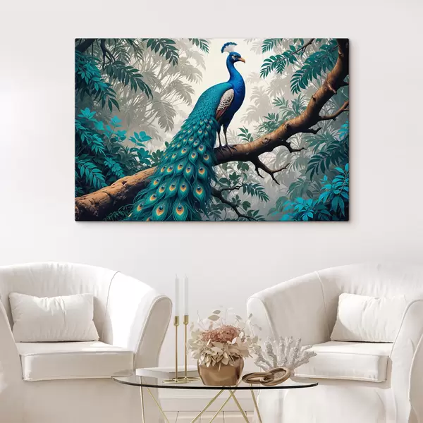 Paveikslas Ryškus mėlynas povas, tupintis ant medžio šakos vešliame atogrąžų miške Nr s39401