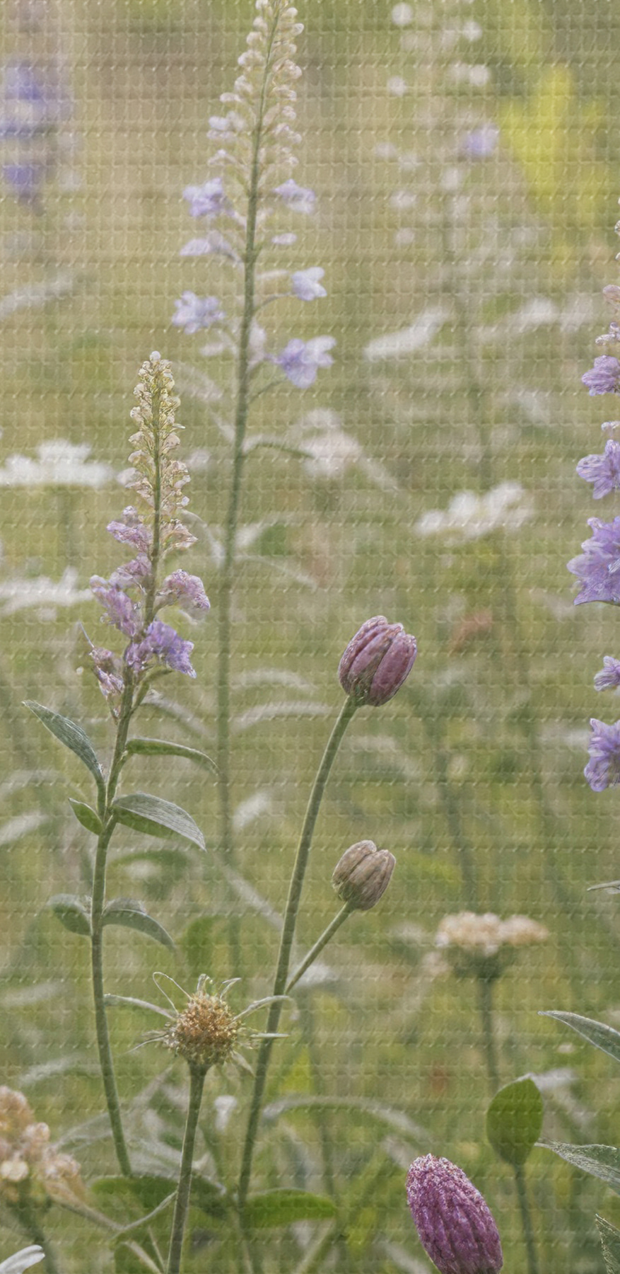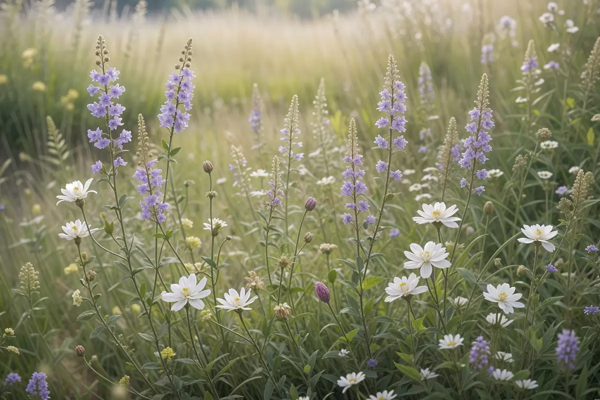 Paveikslas Baltų ramunėlių ir violetinių lubinų laukas su aukšta žole fone Nr s39404