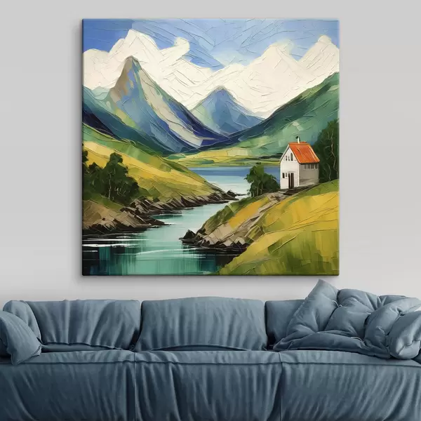 Paveikslas Norvegijos peizažas, žaluma, gražūs kalnai, namelis, gamta, akrilo menas Nr s39422