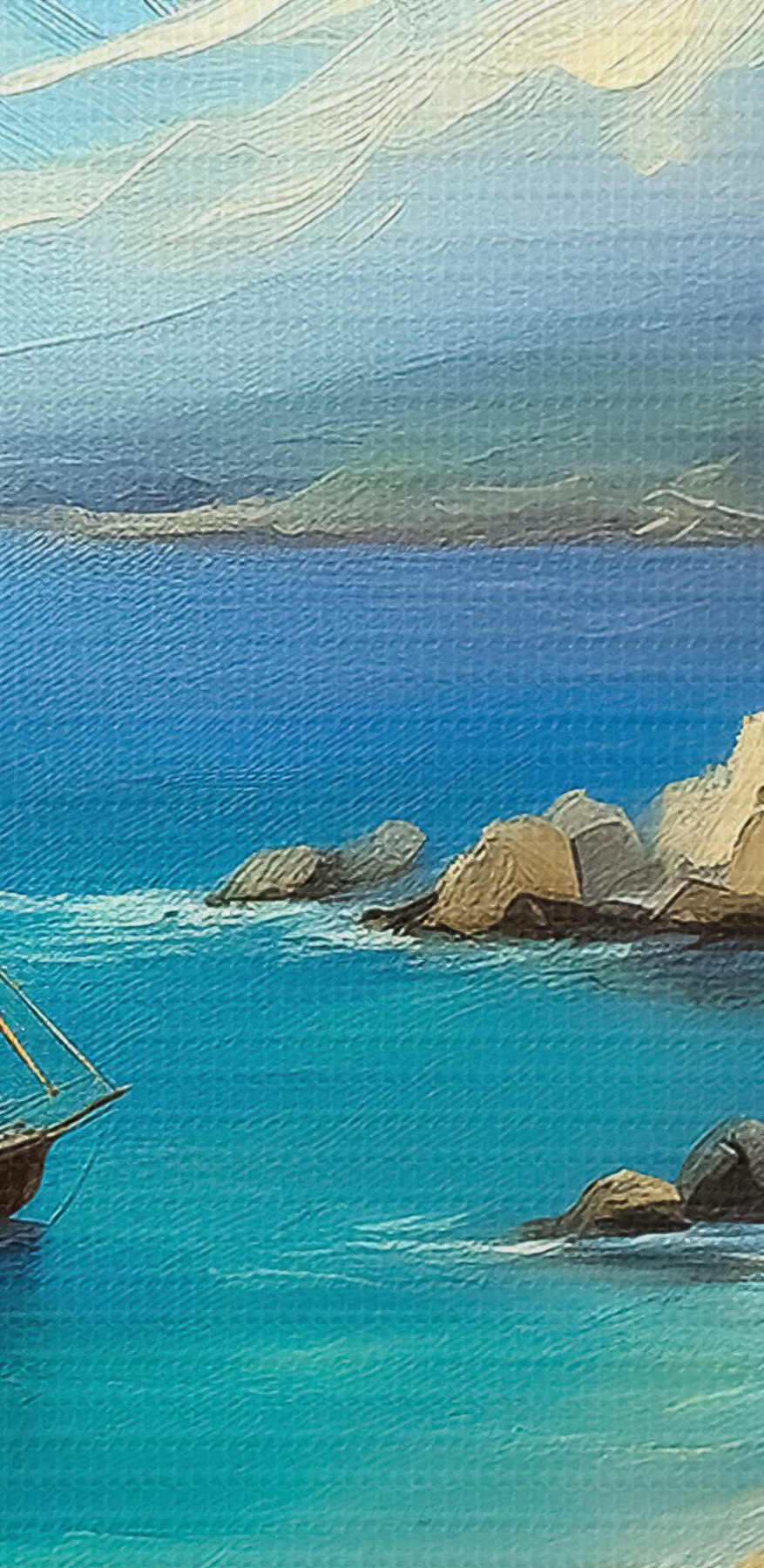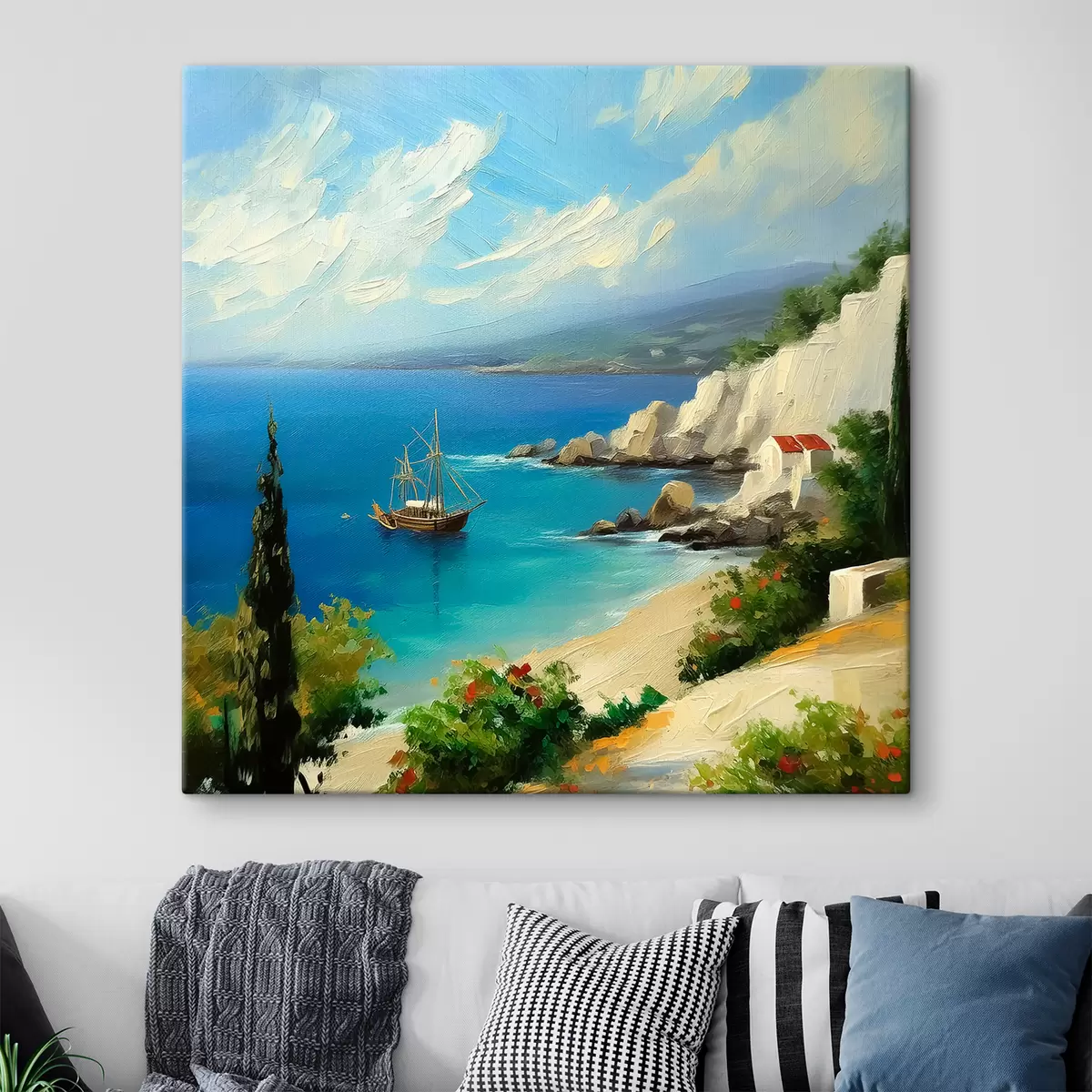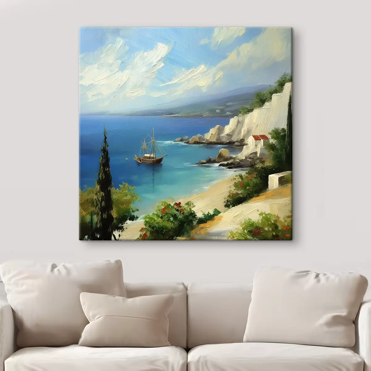 Paveikslas Graikijos jūros pakrantė, laivas, mėlynas vanduo, aliejinė tapyba, vasaros gamta, uolos, ryškūs teptuko potėpiai Nr s39425