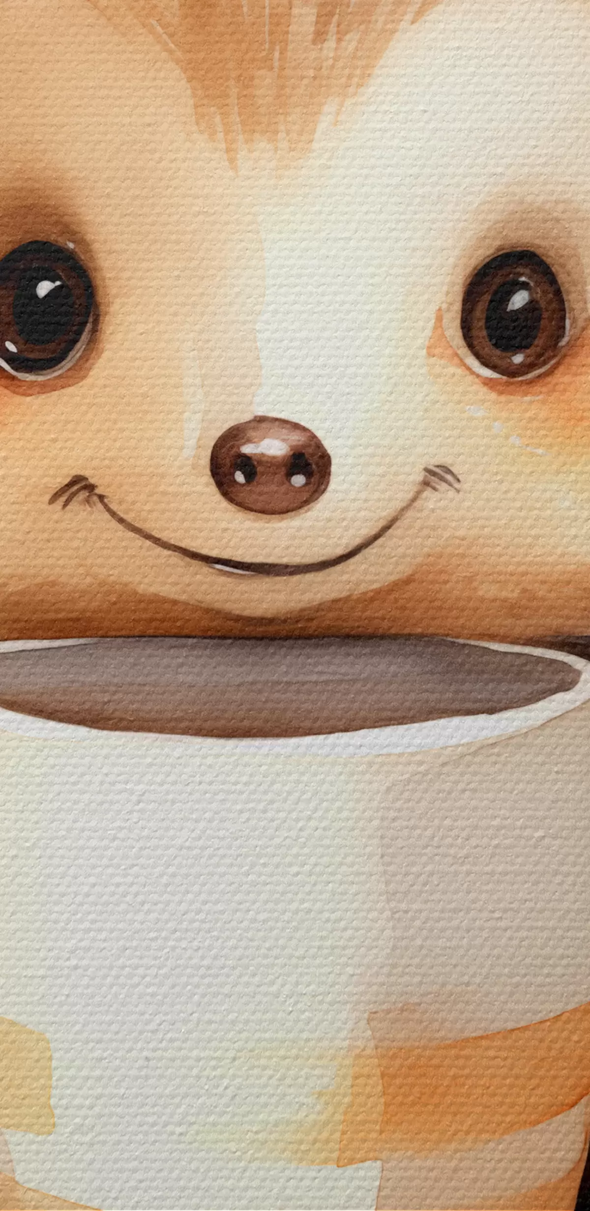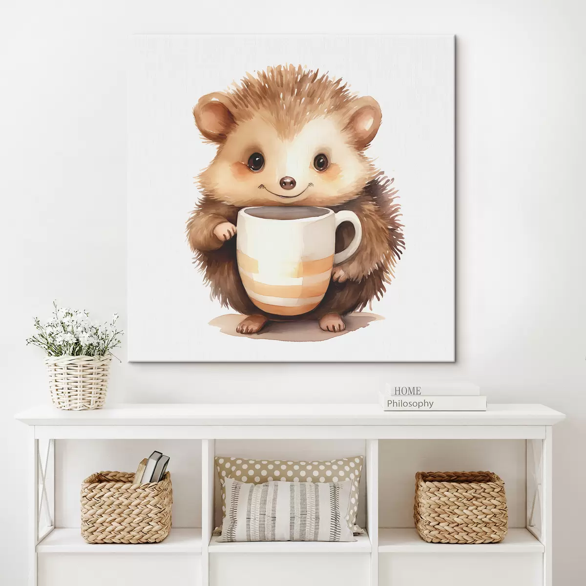 Paveikslas Ežiukas, laikantis letenose baltą puodelį, akvarelinė vaikiška iliustracija Nr s39440