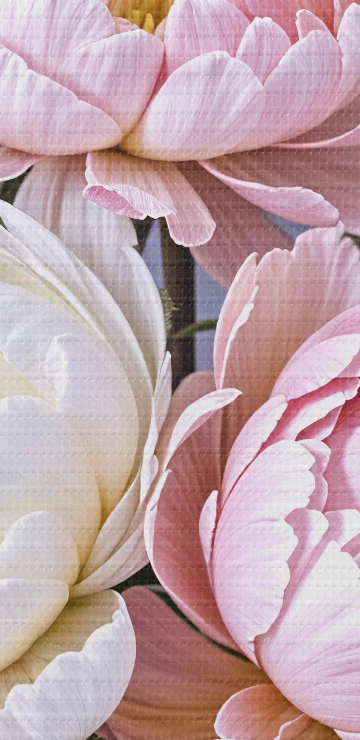 Paveikslas Didelių, sodrių rožinių ir baltų bijūnų gėlių puokštė su žaliais lapais minkštame, neryškiame fone Nr s39514