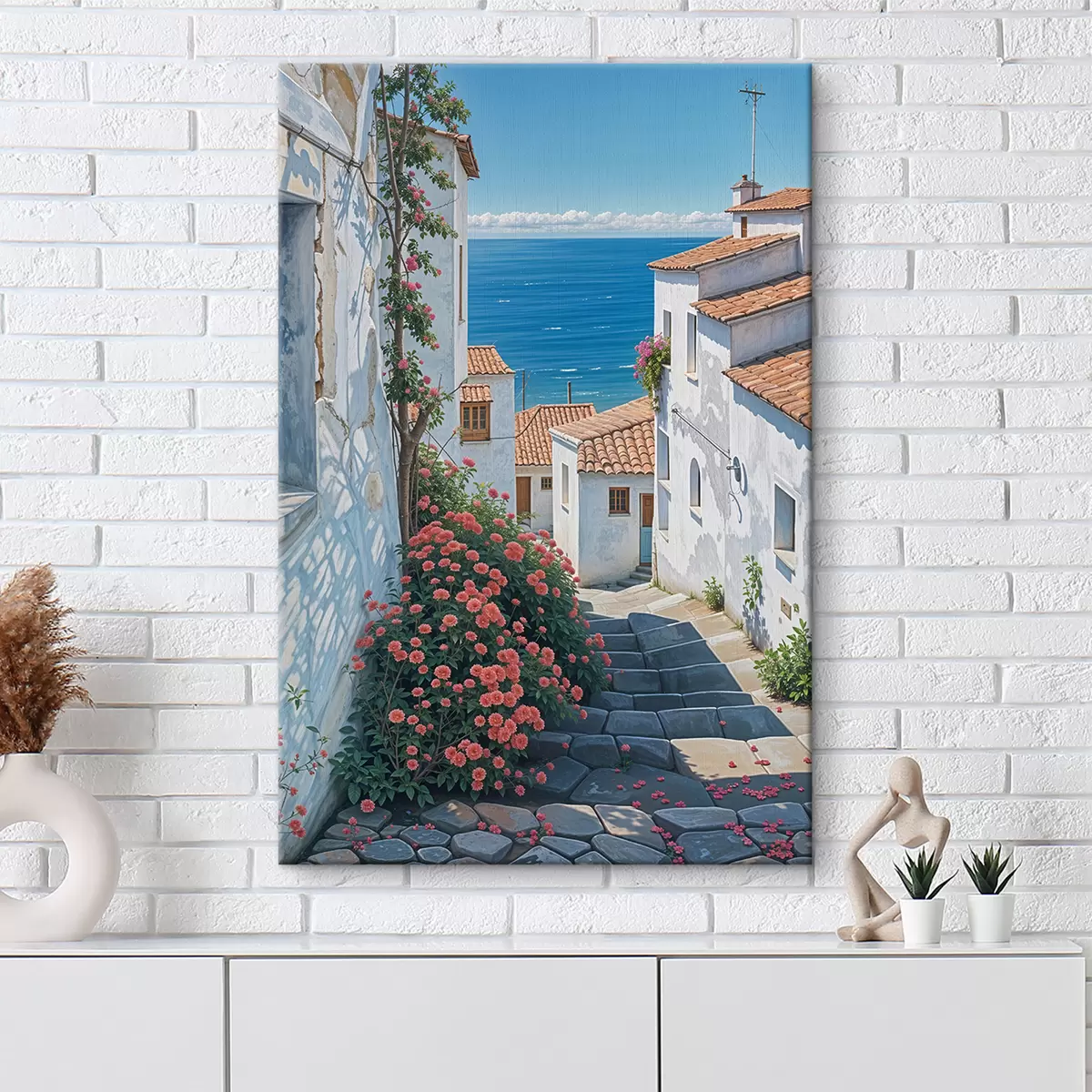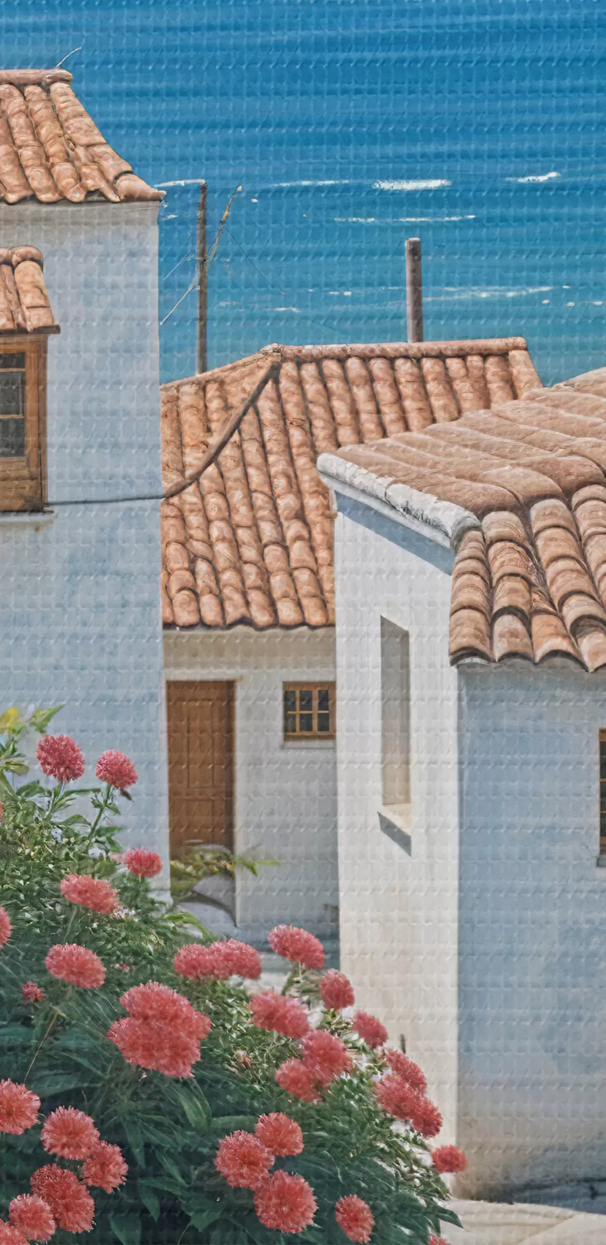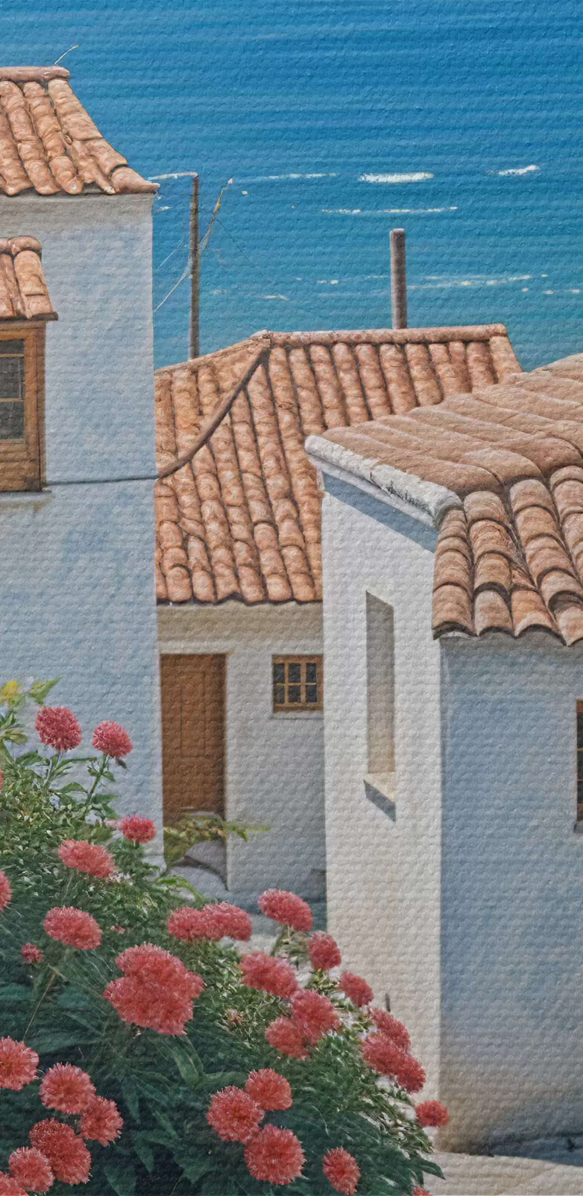 Paveikslas Siaura pakrantės miestelio gatvė su baltais pastatais, raudonų čerpių stogais ir ryškiomis rožinėmis gėlėmis Nr s39532