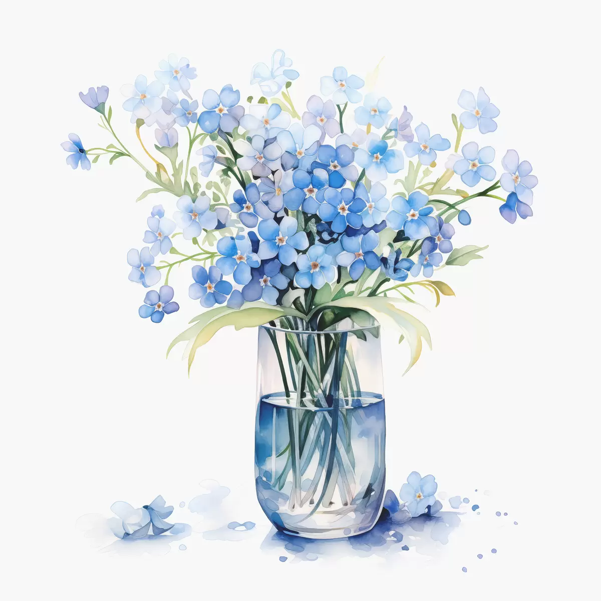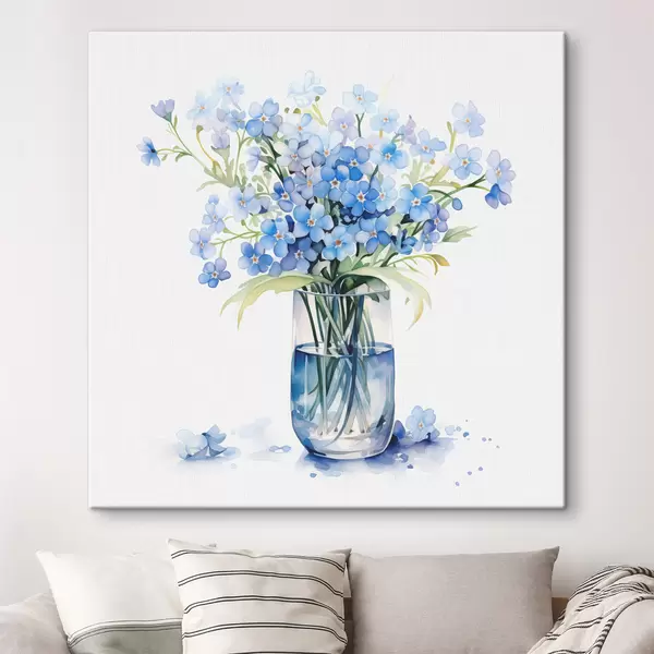Paveikslas Mėlynų lauko gėlių puokštė skaidrioje vazos akvarelėje Nr s39564
