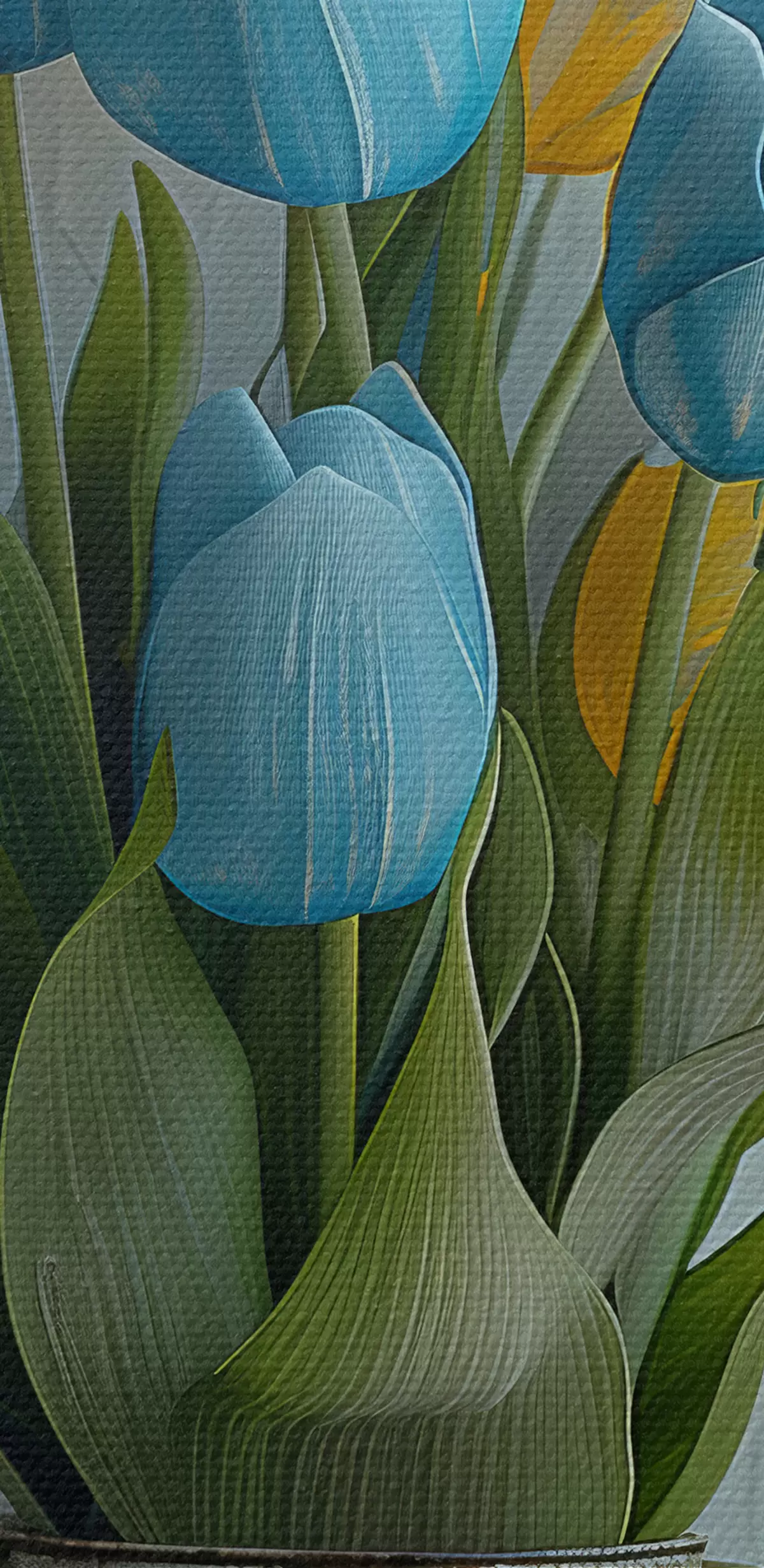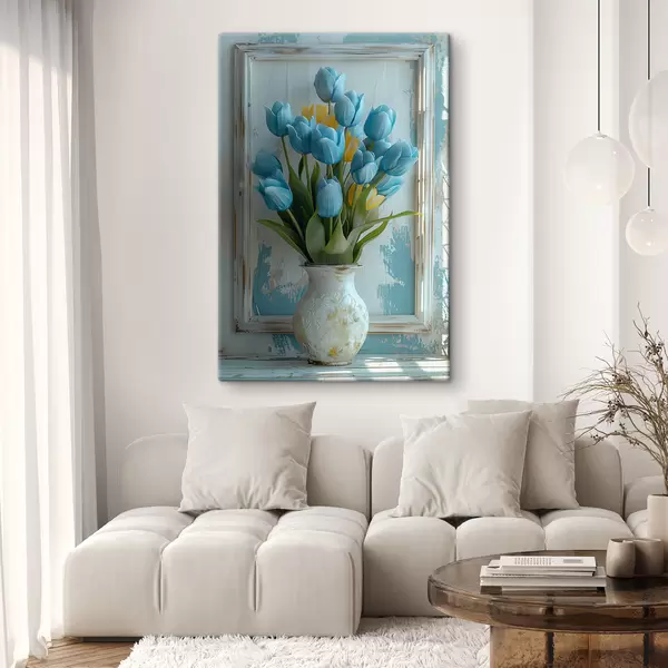 Paveikslas Mėlynos ir geltonos 3D tulpės: elegantiškas sieninis paveikslas su baltu rėmeliu, baltas ir šviesiai mėlynas fonas ir graviruota vaza Nr s39636