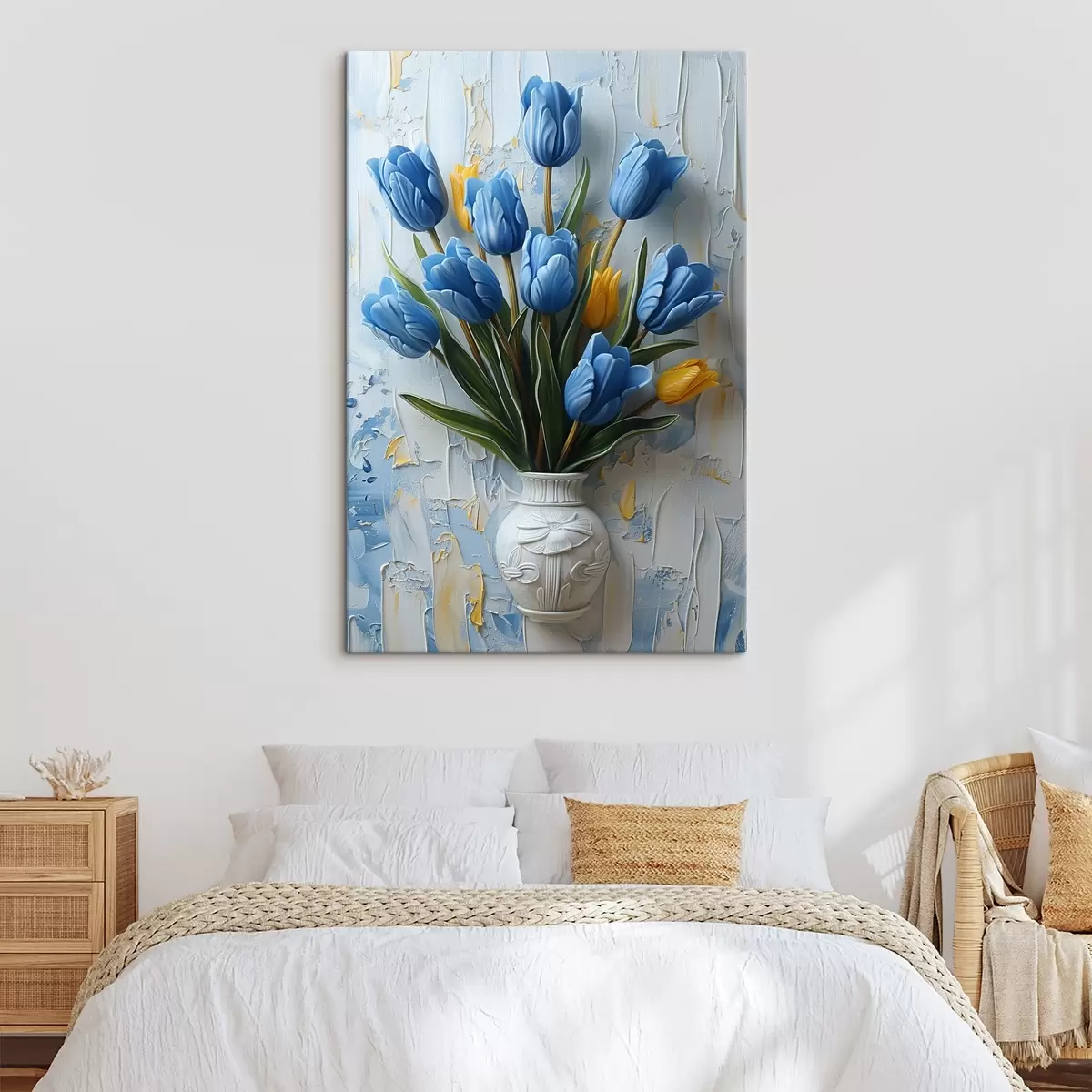 Paveikslas Mėlynos ir geltonos 3D tulpės: elegantiškas aliejumi dažytas sienos paveikslas baltame ir šviesiai mėlyname fone ir išgraviruota vaza Nr s39637