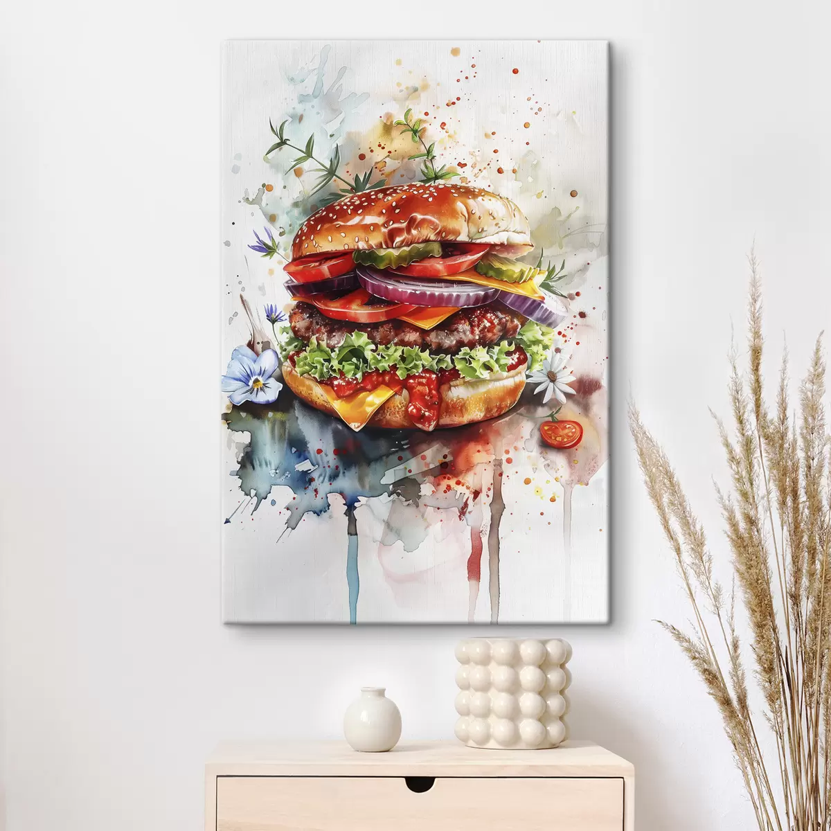 Paveikslas Skanus mėsainis su mėsa, gėlėmis, akvarele, maisto menu Nr s39699