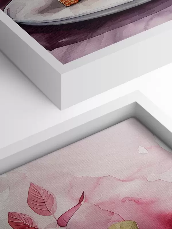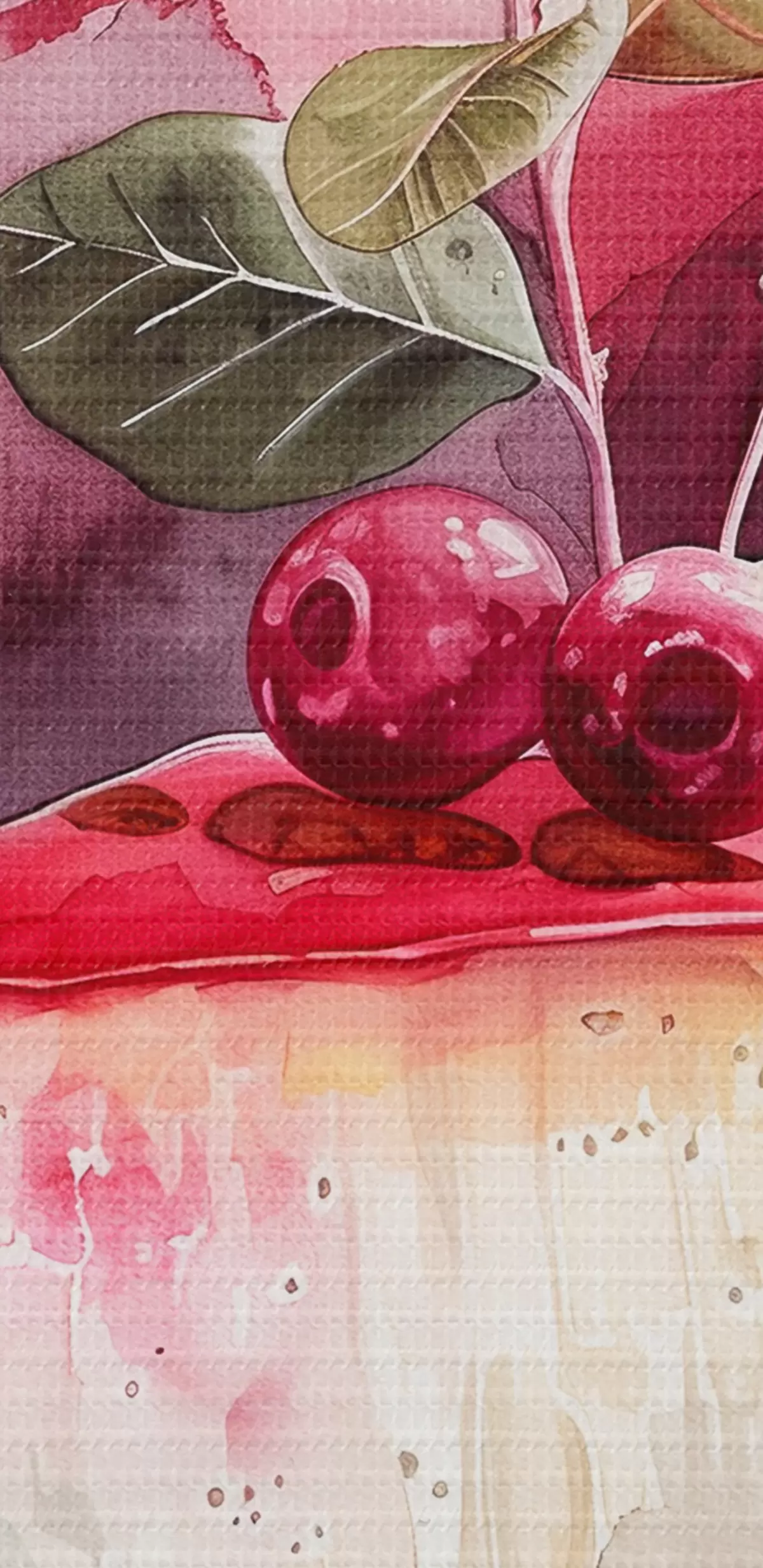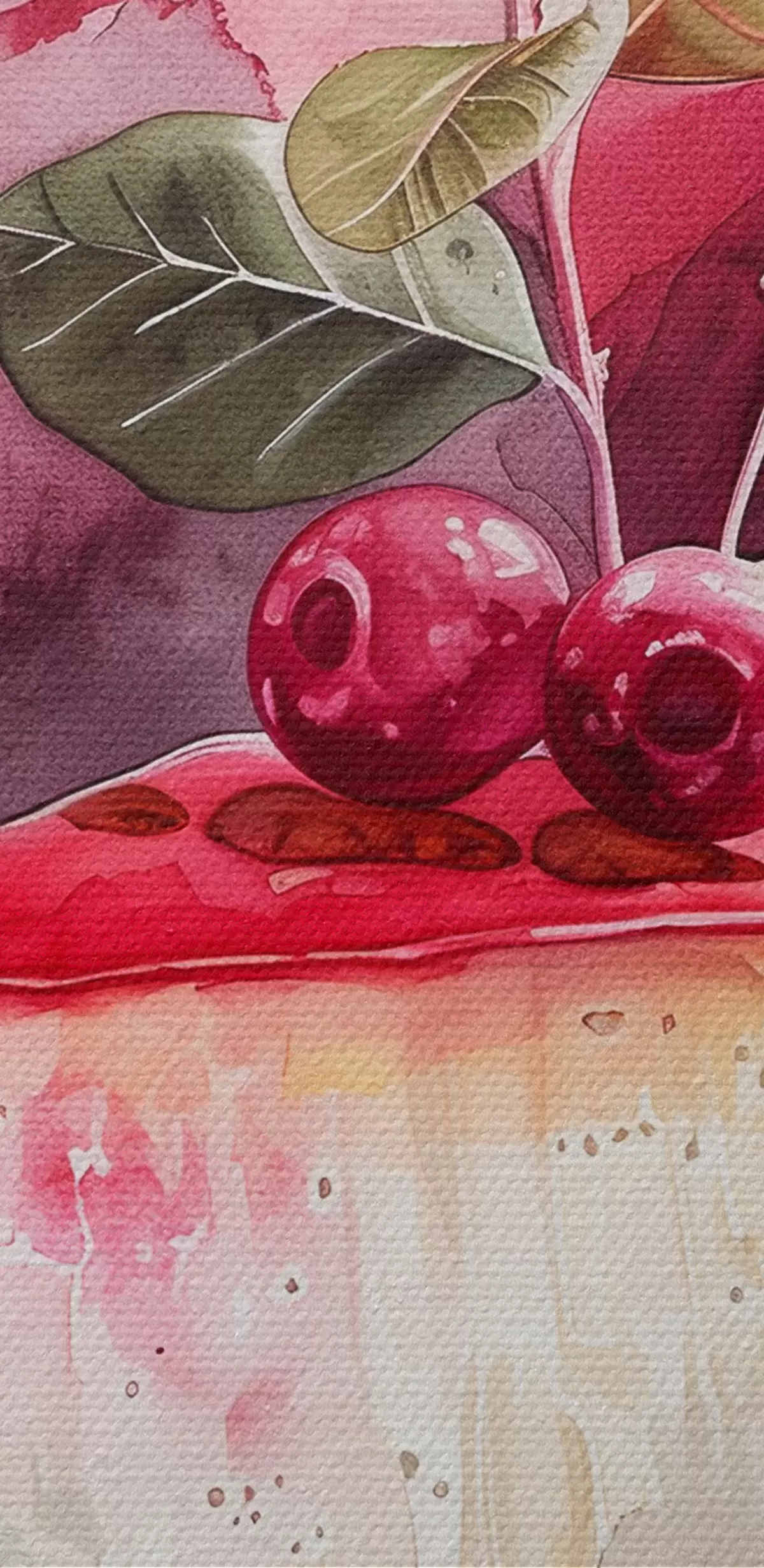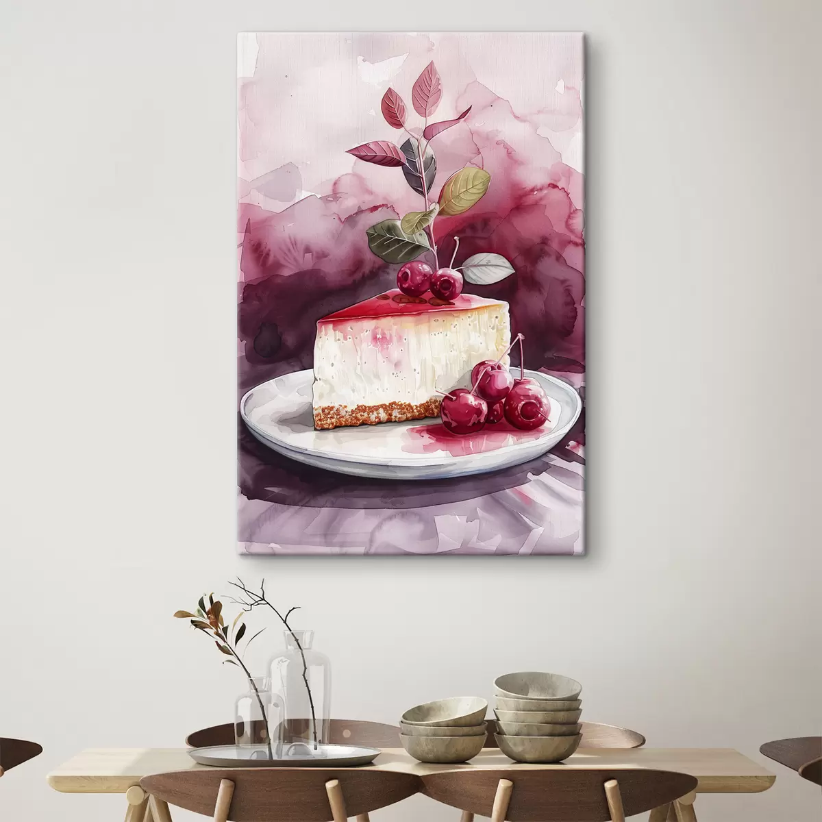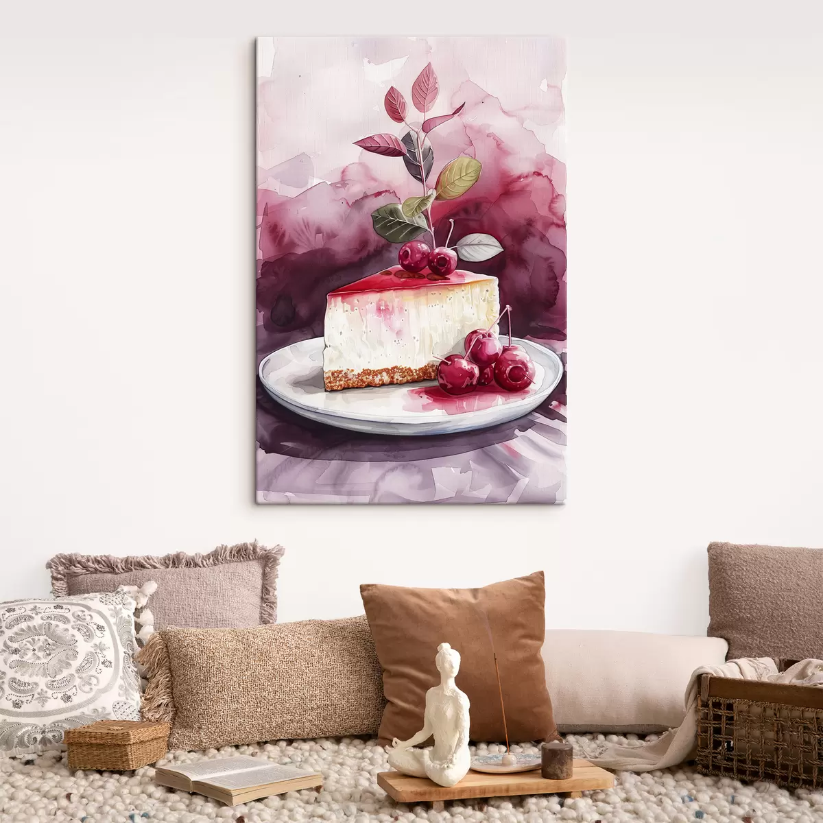 Paveikslas Akvarelinis sūrio pyragas su vyšniomis, elegantiškas maisto menas, raudona ir violetinė spalvos Nr s39700