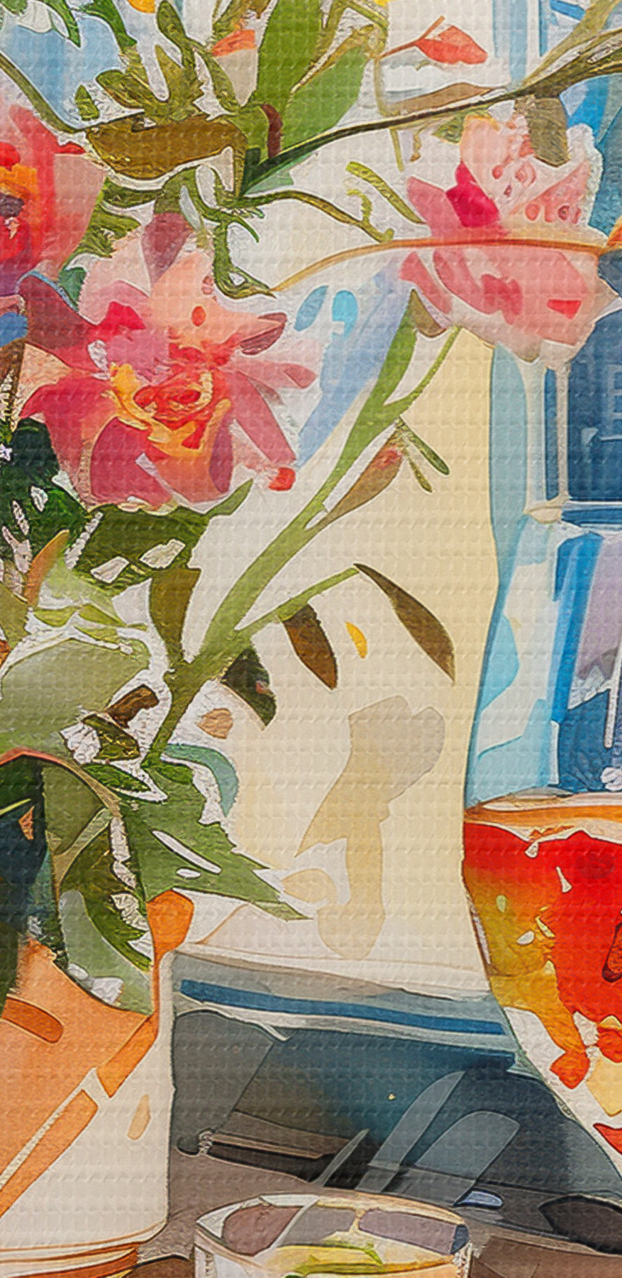 Paveikslas Akvarelės šakelė, saulės šviesa lange, kokteilio taurė, vasaros gėlės Nr s39707