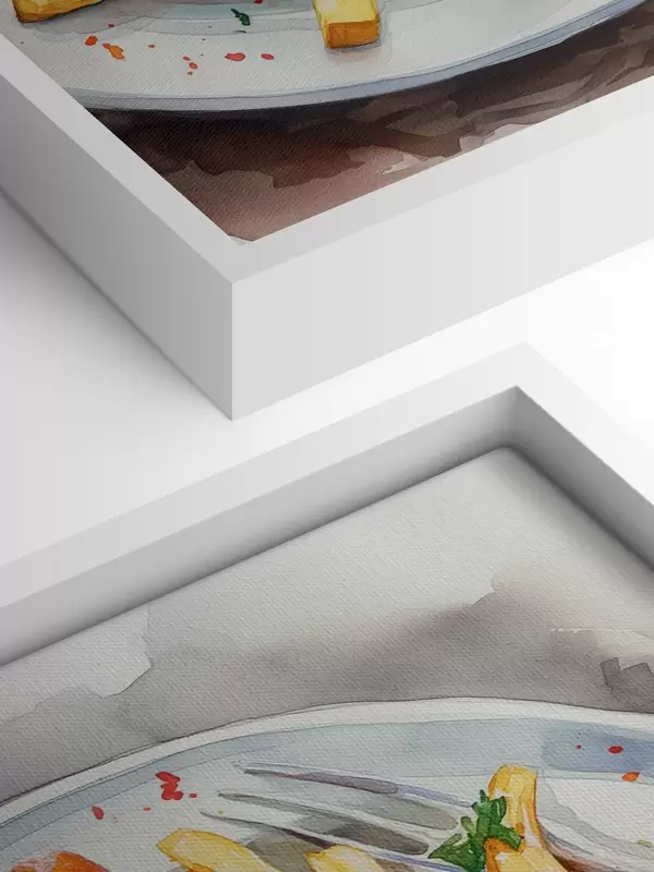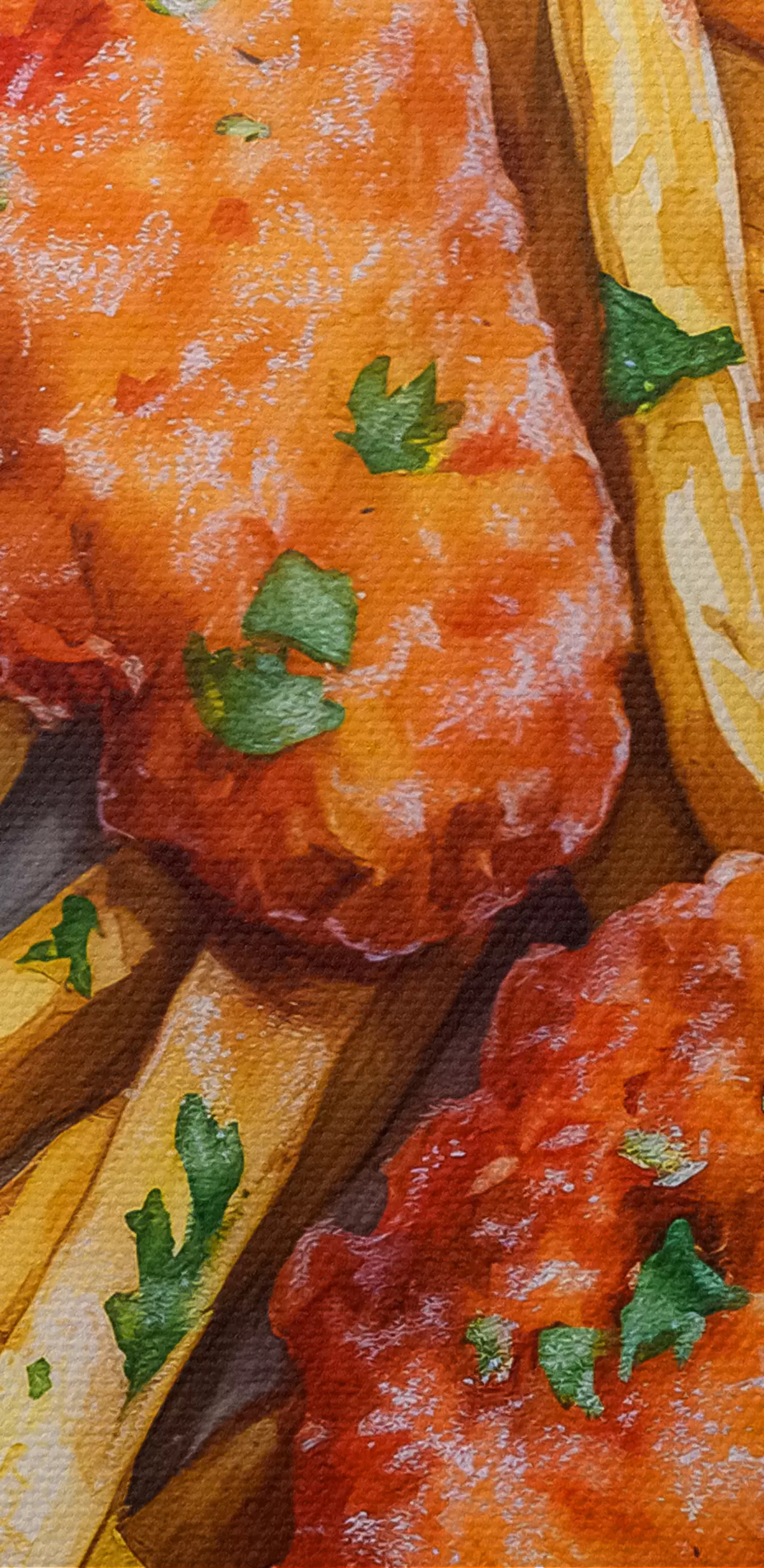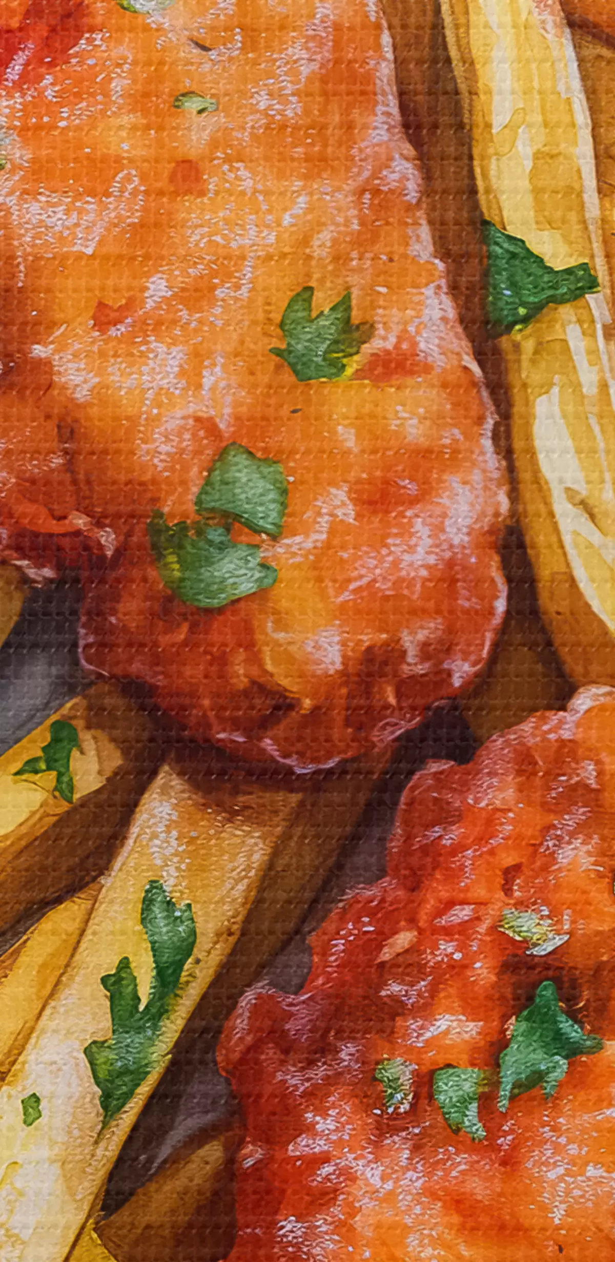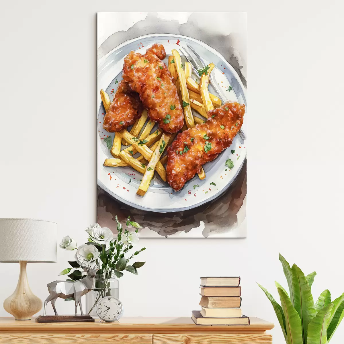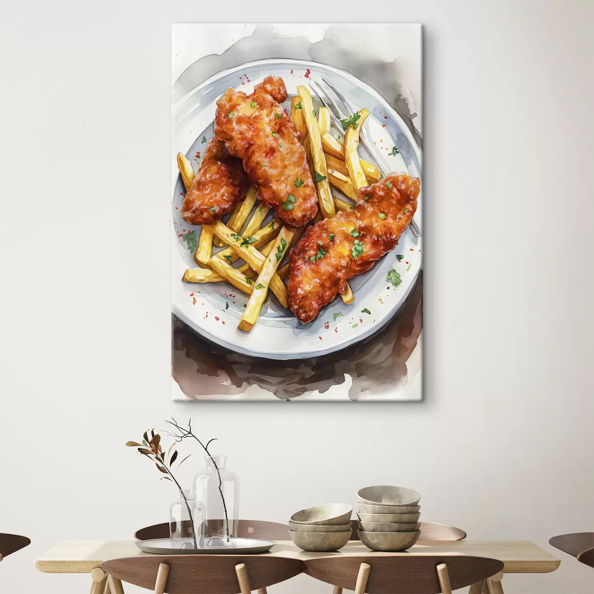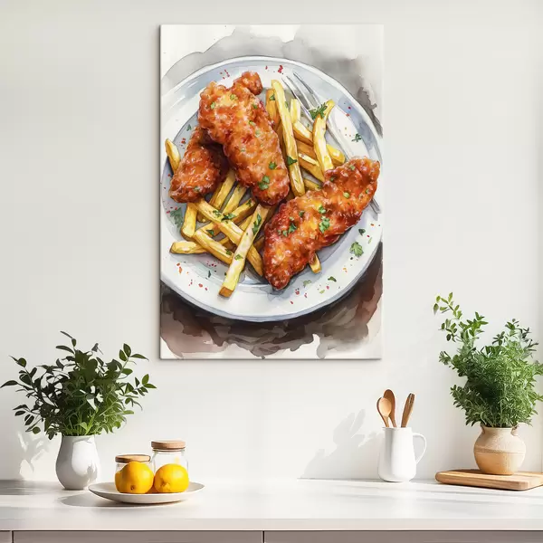 Paveikslas Akvarelinis maisto menas, gruzdintos bulvytės su kepta vištiena, skanu Nr s39708