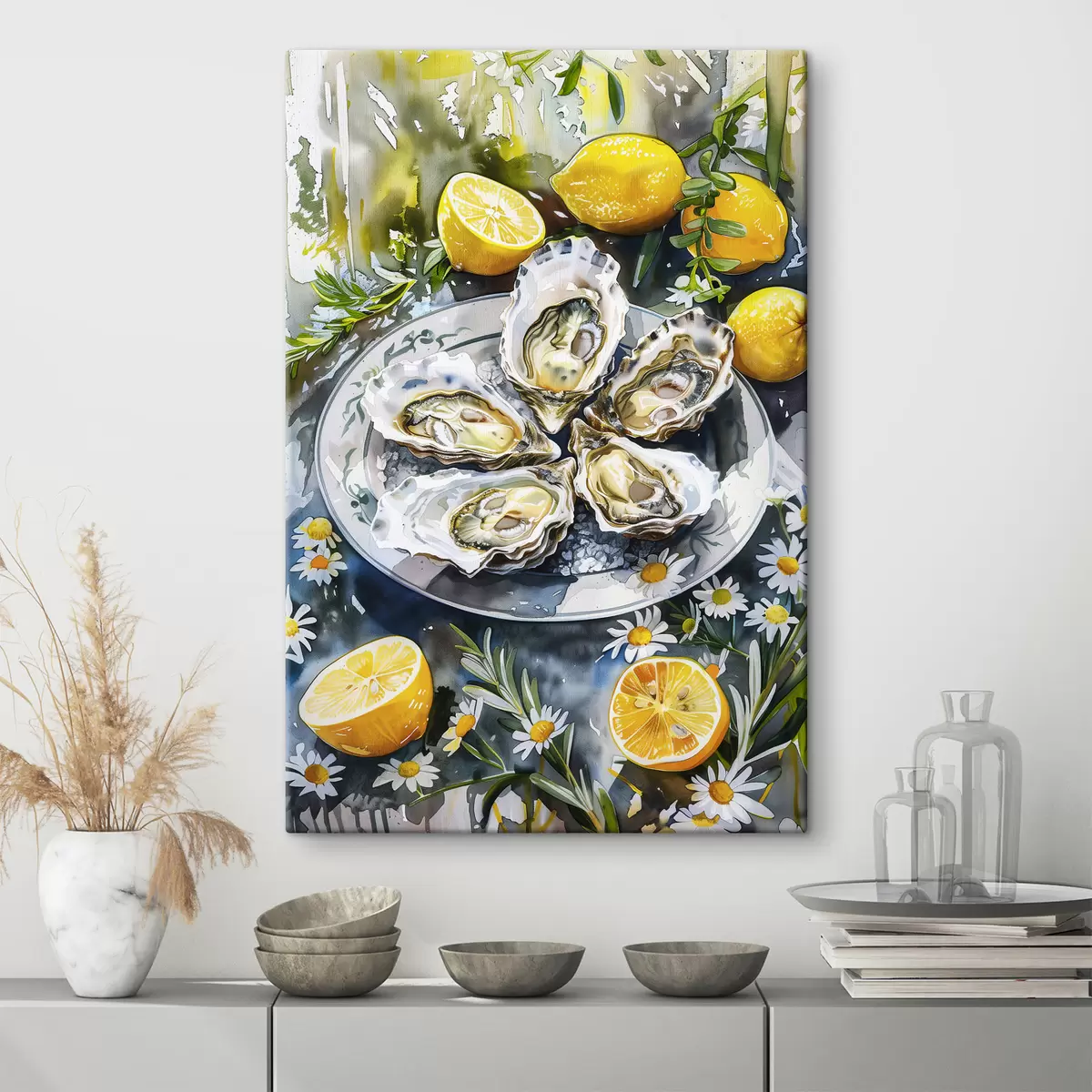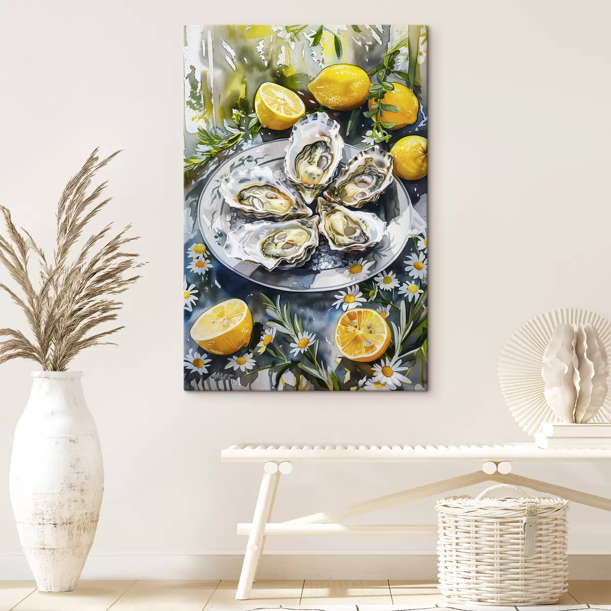 Paveikslas Elegantiškos austrės lėkštėje, citrinos ir gėlės, vasariškos spalvos, Viduržemio jūros Nr s39710